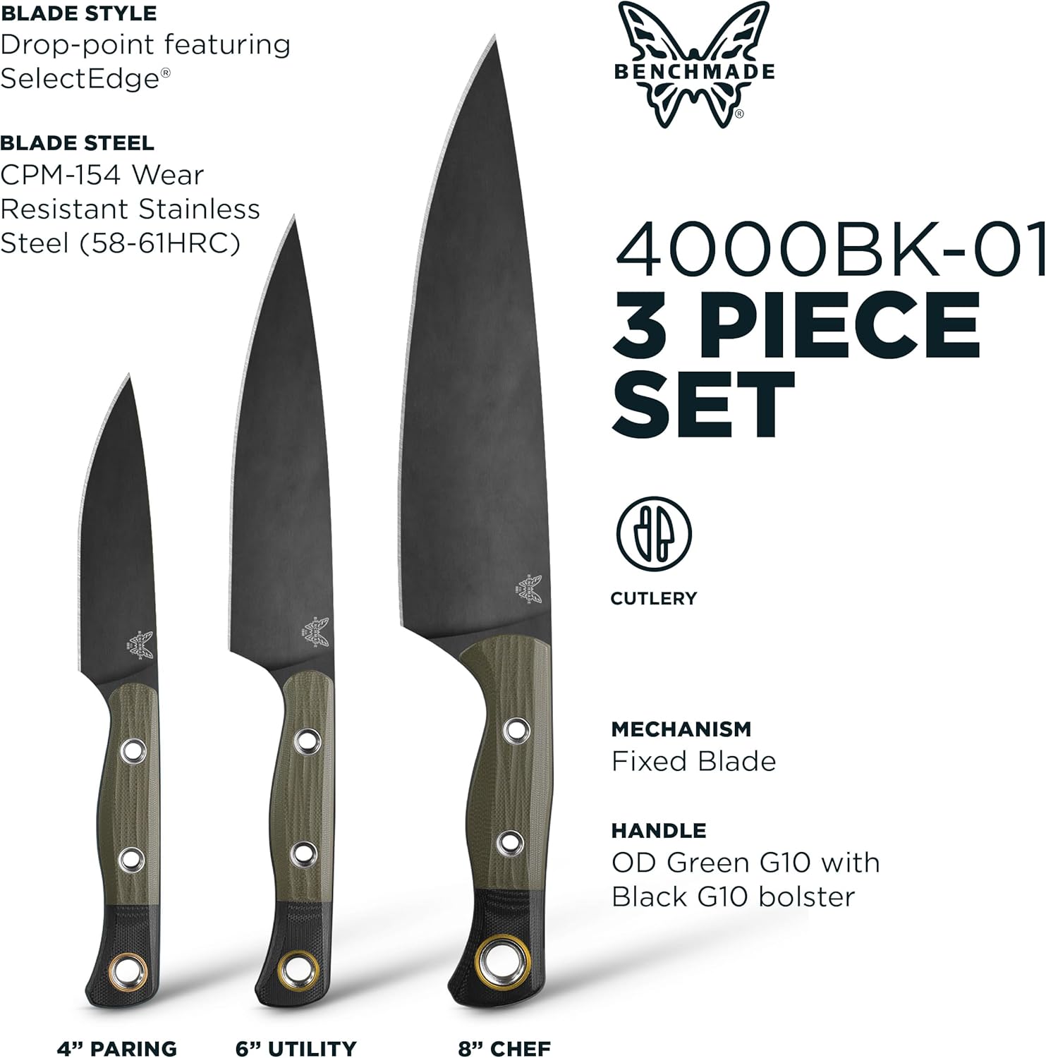Benchmade – 3 Piece Cutlery Kitchen Culinary Knife Set, OD Green G10 Handle with Black G10 Bolster (4000BK-01)