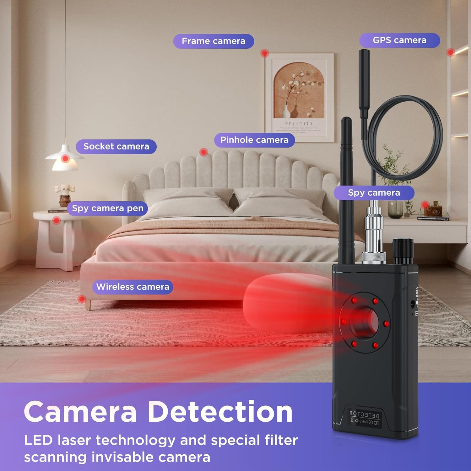 [Security & Durable] The detection function provided by camera detectors can effectively protect personal life, preventing you from being recorded without their knowledge.Our detector adopts digital receiving method, effectively eliminating signal interference from common household equipment.