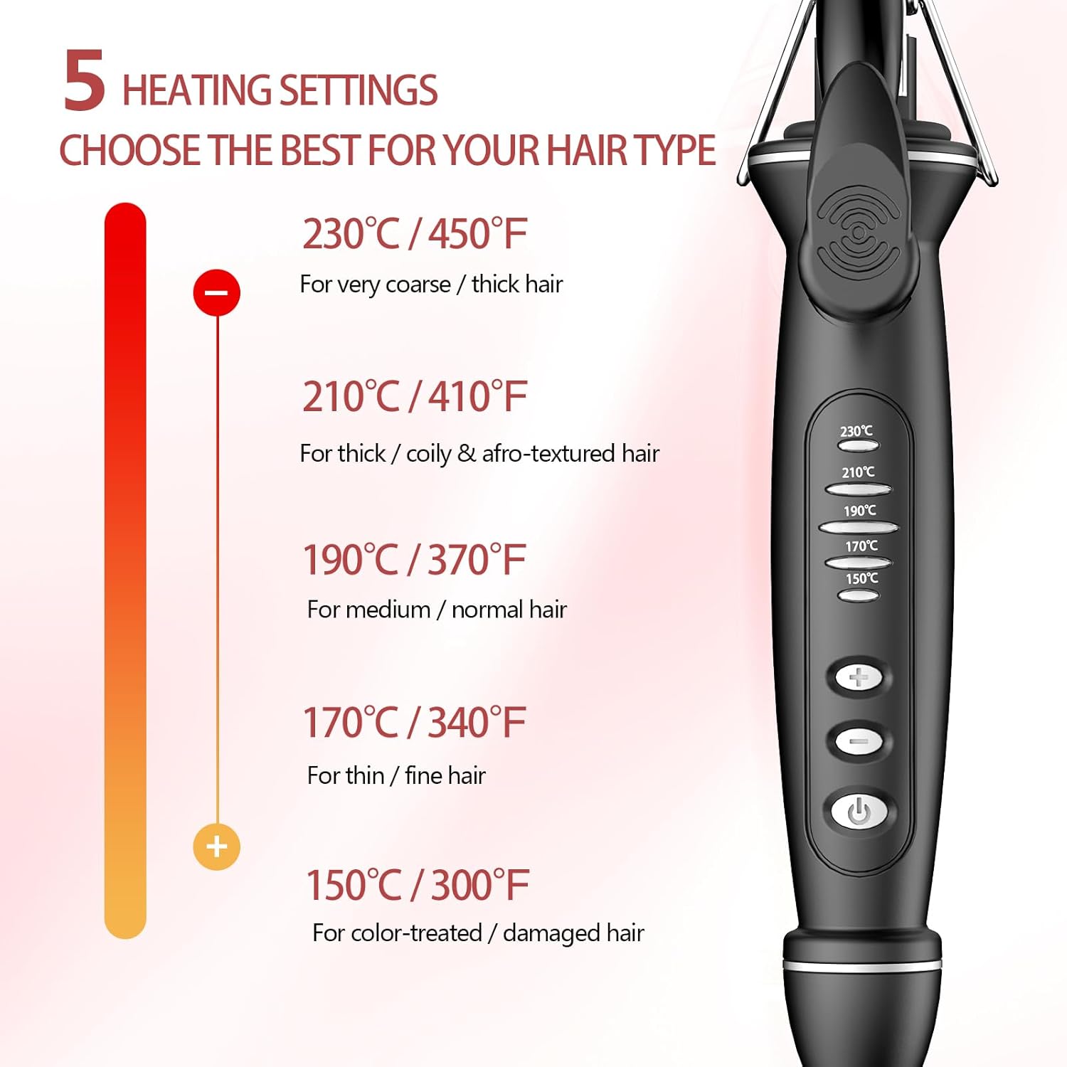 【Suitable for All Hair Types】: The 1/2 inch curling iron features 5 preset temperature settings (150℃/300℉ to 230℃/450℉), catering to various hair types and styling needs. It works perfectly for fine, normal, and even thick, coarse hair, effortlessly achieving salon-quality curls or waves.