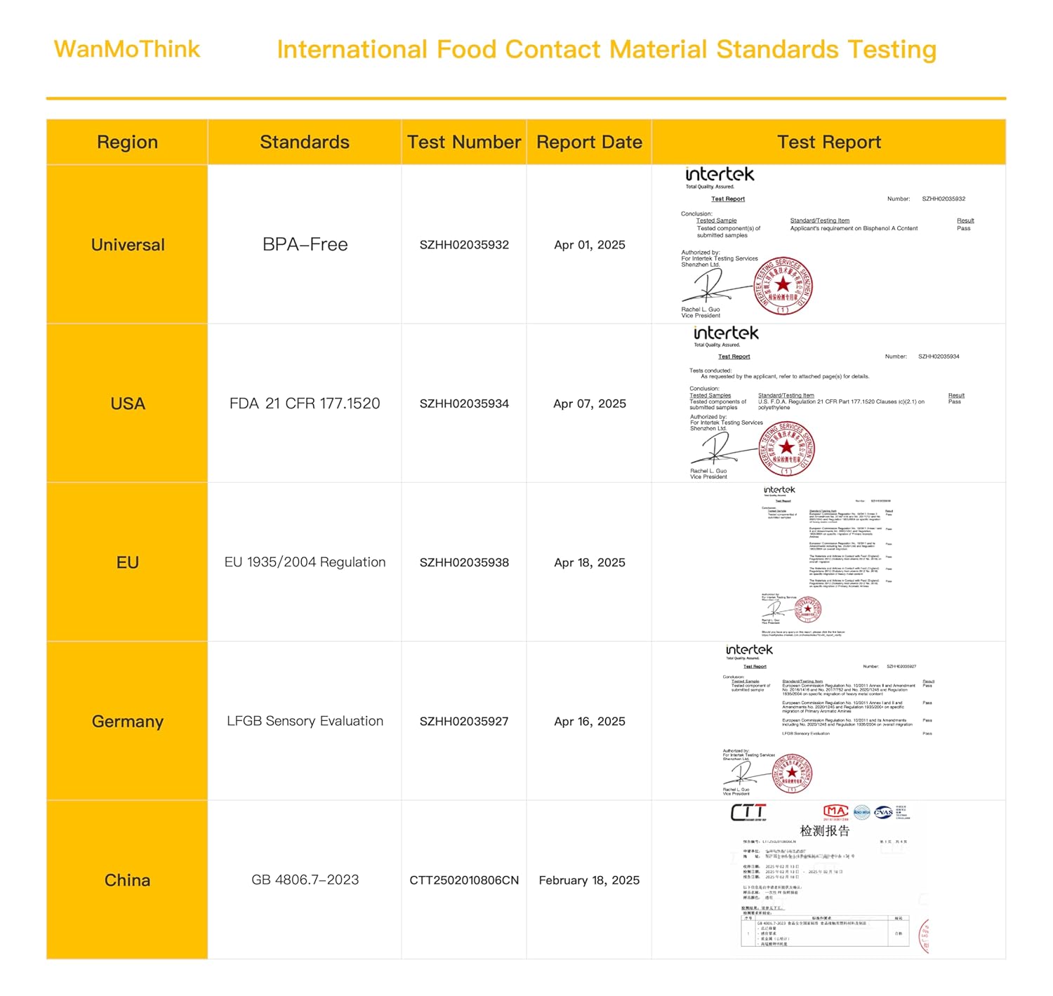 Food-grade contact material standards were tested by Intertek Testing Services Shenzhen Ltd. on December 22, 2023.BPA-free testing was conducted by Intertek Testing Services Shenzhen Ltd. on December 22, 2023.BPA-Free testing was conducted by Intertek Testing Services Shenzhen Ltd. on Apr 01, 2025.USA FDA 21 CFR 177.1520 testing was conducted by Intertek Testing Services Shenzhen Ltd. on Apr 07, 2025.EU 1935/2004 Regulation testing was conducted by Intertek Testing Services Shenzhen Ltd. on Apr 18, 2025.LFGB Sensory Evaluation testing was conducted by Intertek Testing Services Shenzhen Ltd. on Apr 16, 2025China GB 4806.7-2023 testing was conducted by Guangdong Zhongding Testing Technology Co., Ltd. on February 18, 2025