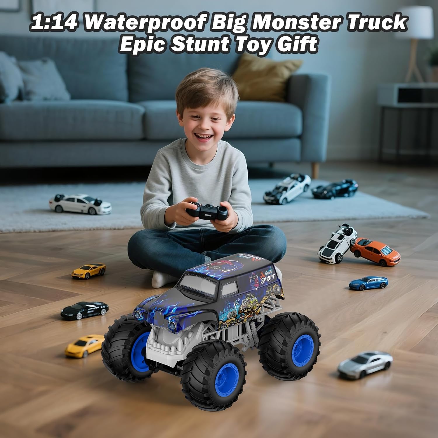 WATERPROOF OFF-ROAD MONSTER TRUCK: Certified sealed electronics design makes this truck an all-terrain vehicle, built-in powerful electric dual motors, unique design, equipped with all-terrain high-quality soft elastic rubber anti-skid tires, can easily drive and float in water, drive on land and keep going to cross snow, mud, rocks, and more.
