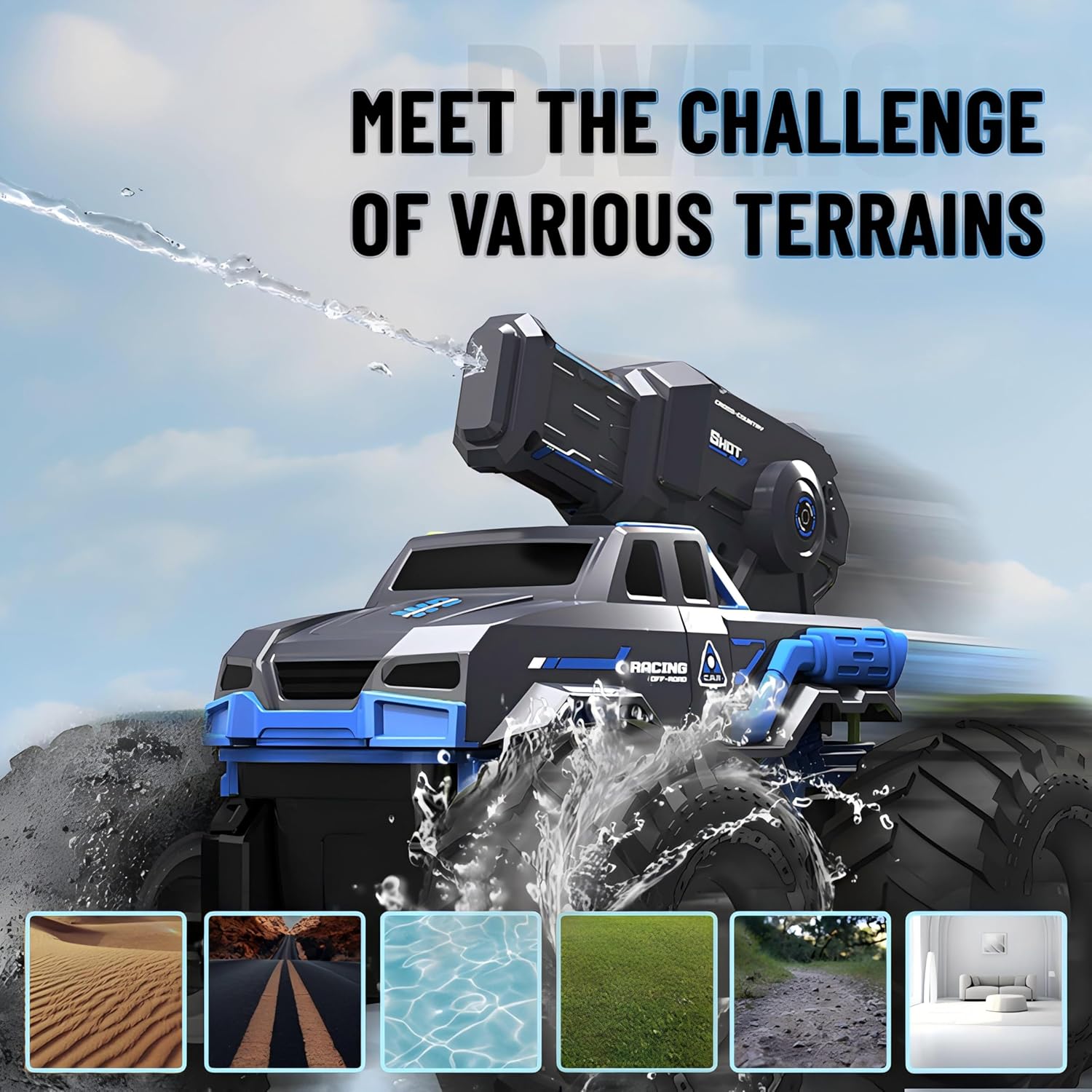 RC Car with Water Spray Gun: 💦 Elevate your playtime with the integrated RC water gun, designed for thrilling water battles. Shoot water up to 20 feet, whether you’re racing across the ground or splashing through water. This feature adds extra excitement to your off-road RC truck adventures, turning this amphibious vehicle into a true water-blasting machine. Perfect for cooling off on hot days or engaging in epic water fights.