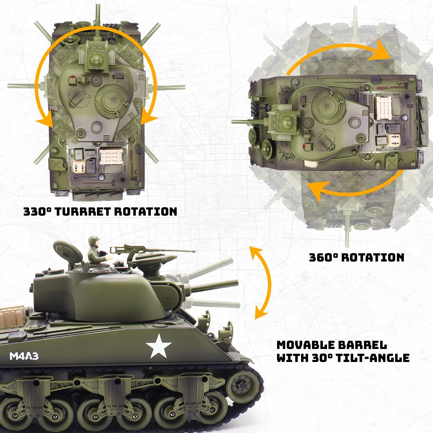 The body of the tank can be rotated 360° by remote control, the barrel of the tank can be moved up and down, and the turret of the tank can be rotated 330°, which is a very realistic tank