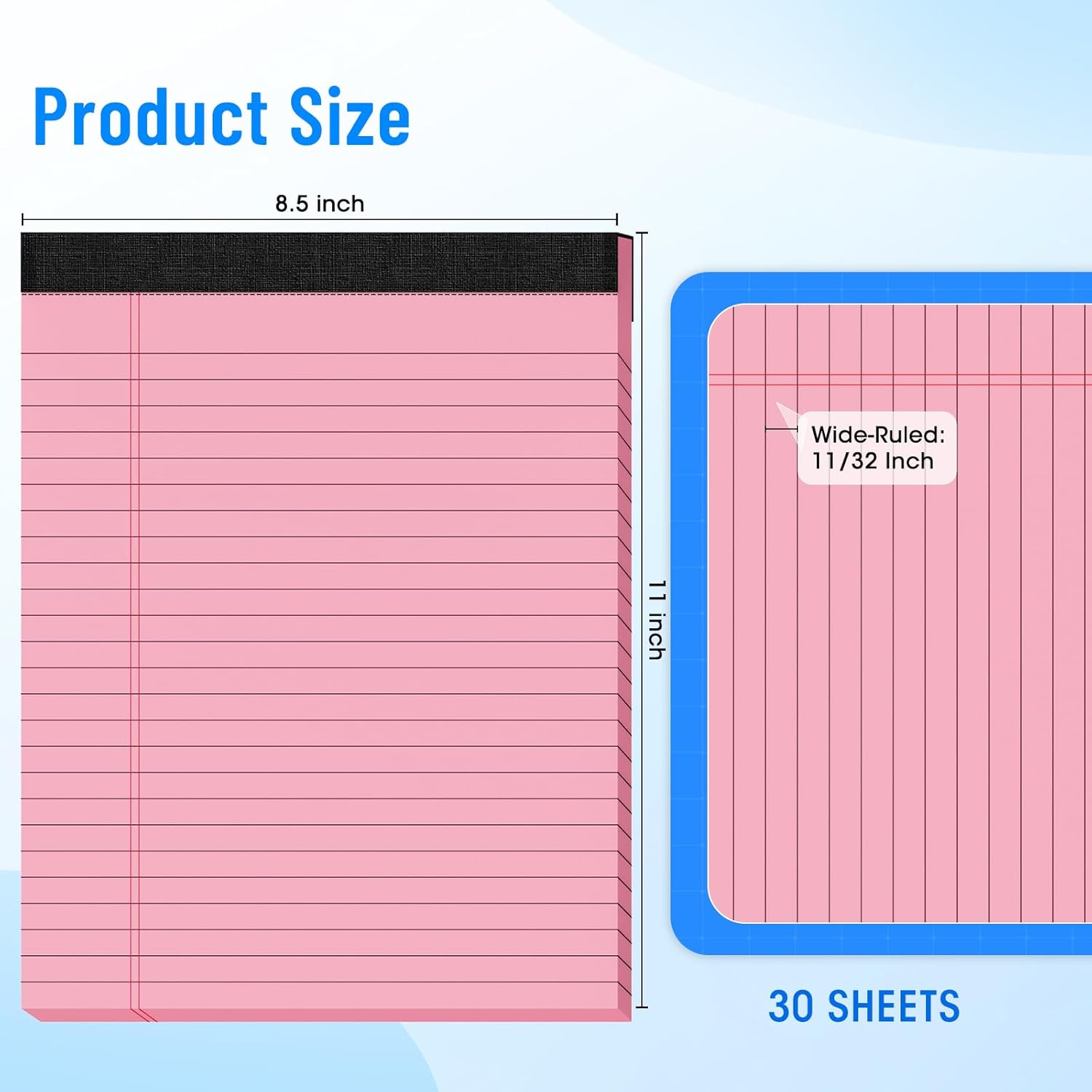PRODUCT SIZE AND NUMBER OF PAGES: Sufficient number of pages (30 sheets per pack,12 packs ,total of 360Sheets), Spacing 9MM line of notepads (Wide-Ruled: 11/32 Inch), convenient of size (8.5x11inch), and 8.5×11 inch size makes it versatile and can be used to create reminders, to-do lists and notes.