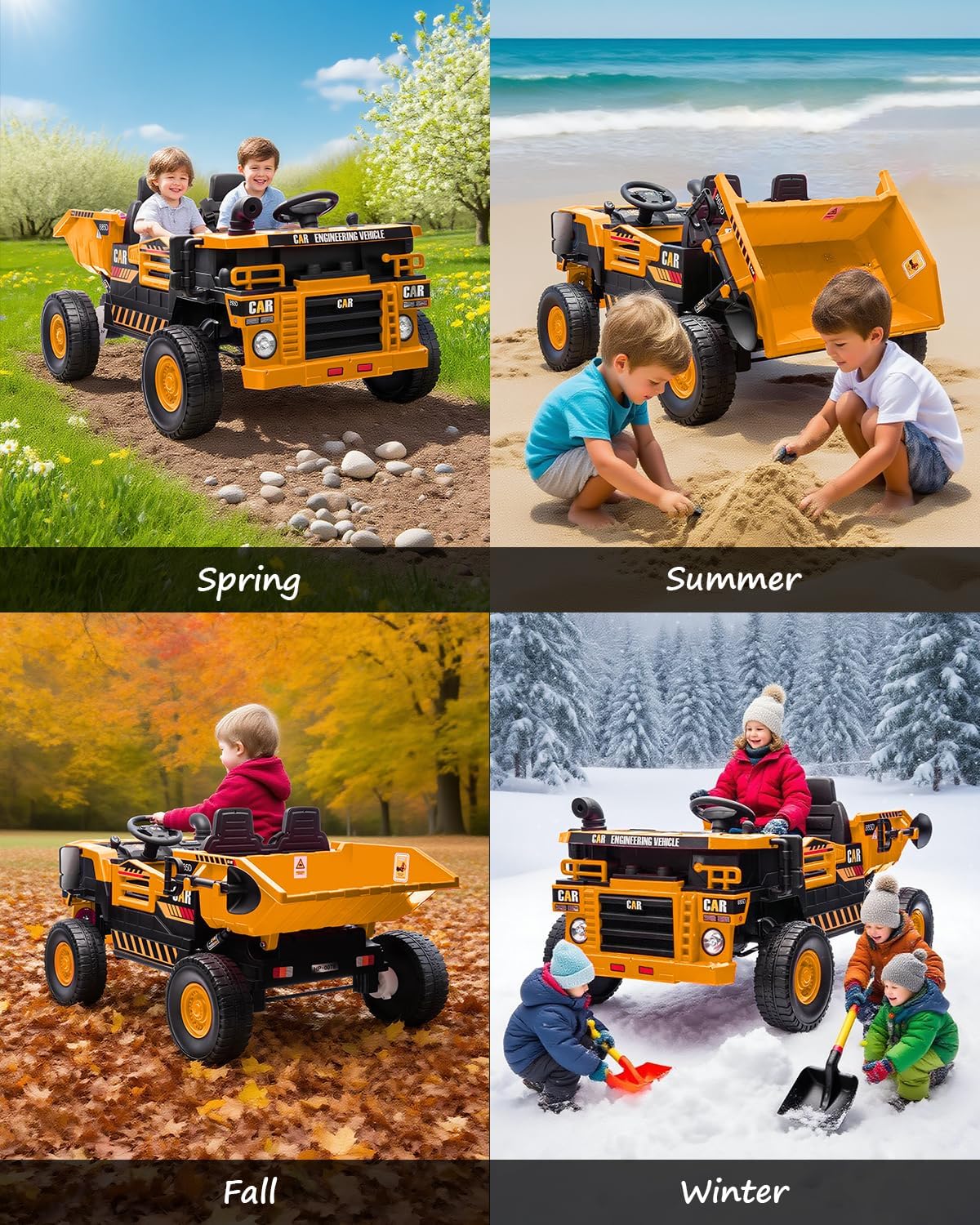 【12V and 4 powerful motors】This ride-on dump truck is powered by a 12V battery. It is equipped with four wear-resistant tires and a powerful spring suspension system, making it suitable for a variety of road conditions. Additionally, the 20-inch wide dual seats not only provide continuous power but also ensure the child’s comfort. Soft-start technology ensures smooth acceleration. It Can drive normally on grass, gravel roads, asphalt roads, dirt roads, and wooden board roads.