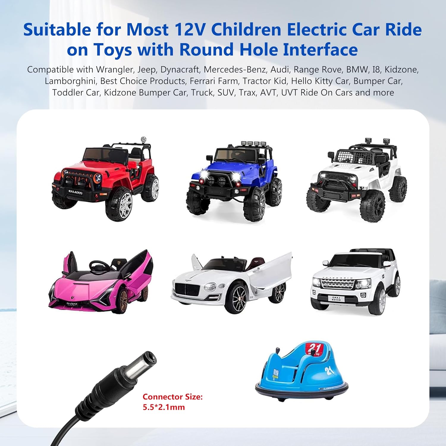 12V Battery Charger Compatible with Wrangler, Jeep, Dynacraft, Mercedes-Benz, Audi, Range Rove, BMW I8, Kidzone, Lamborghini, Best Choice Products, Ferrari Farm, Tractor Kid, Hello Kitty Car, Bumper Car ,Toddler Car, Kidzone Bumper Car, Truck, SUV, Trax, AVT, UVT Ride On Cars and more