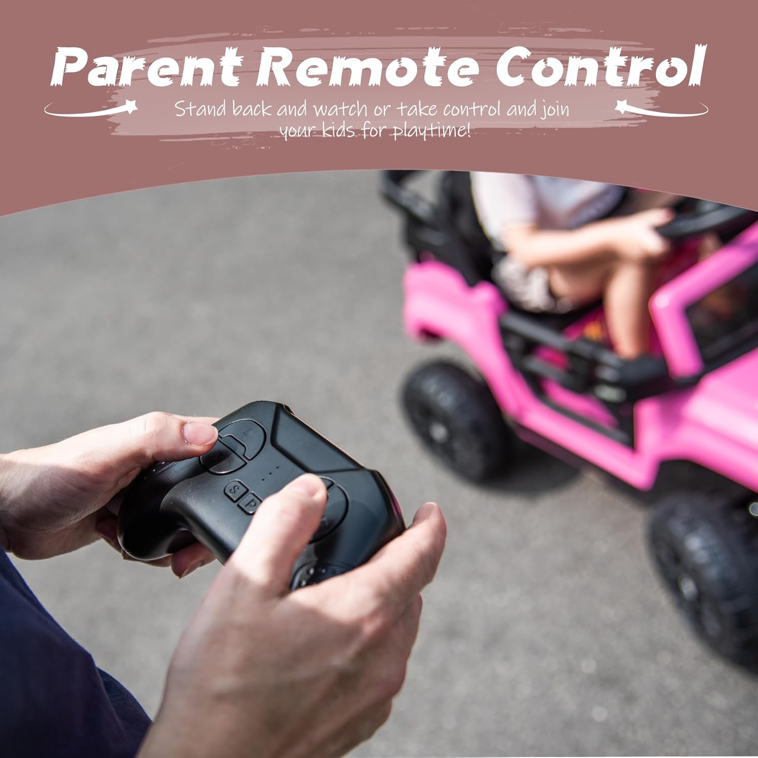 Safe Driving:Kids electric car comes with 4 wear-resistant PP plastic tires, thickened iron structure, spring suspension, 3-point seat belt and 2 lockable doors for maximum safety when driving on various terrains