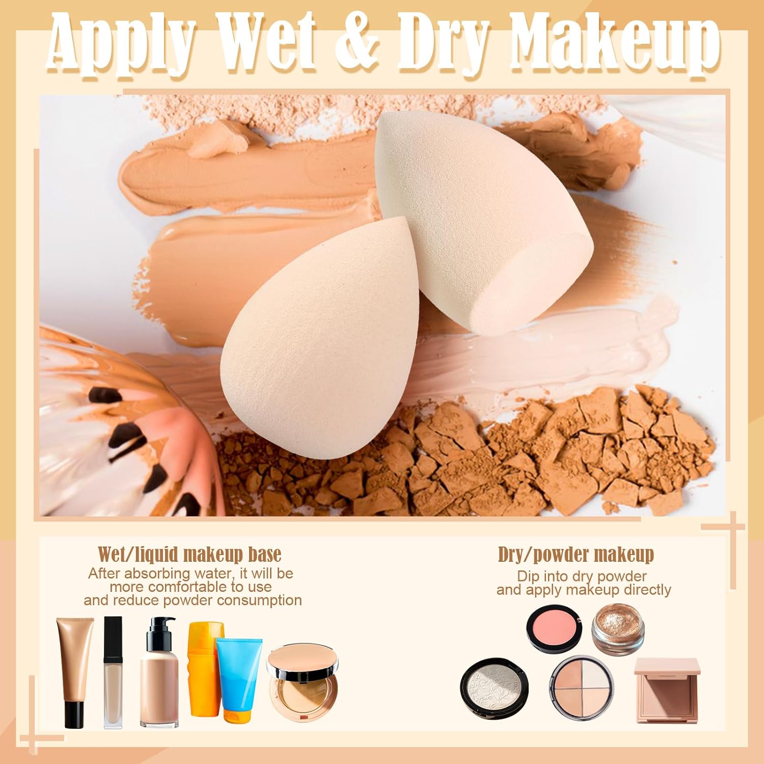 6 PCS skin color makeup eggs: The 6 large makeup sponges of different shape in the makeup egg set can be used for facial foundation. If you have dry skin, you can wet the makeup eggs and use them. There are enough for you to use for a while