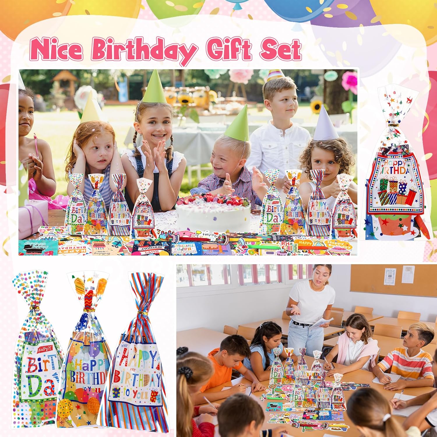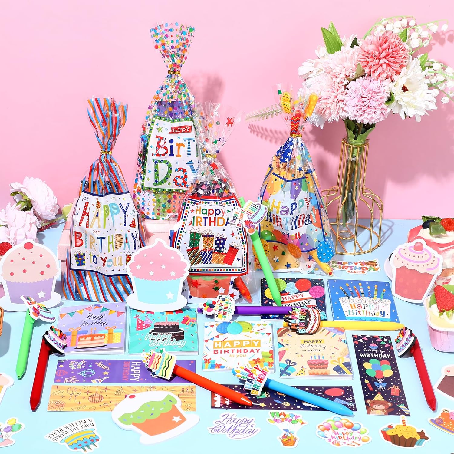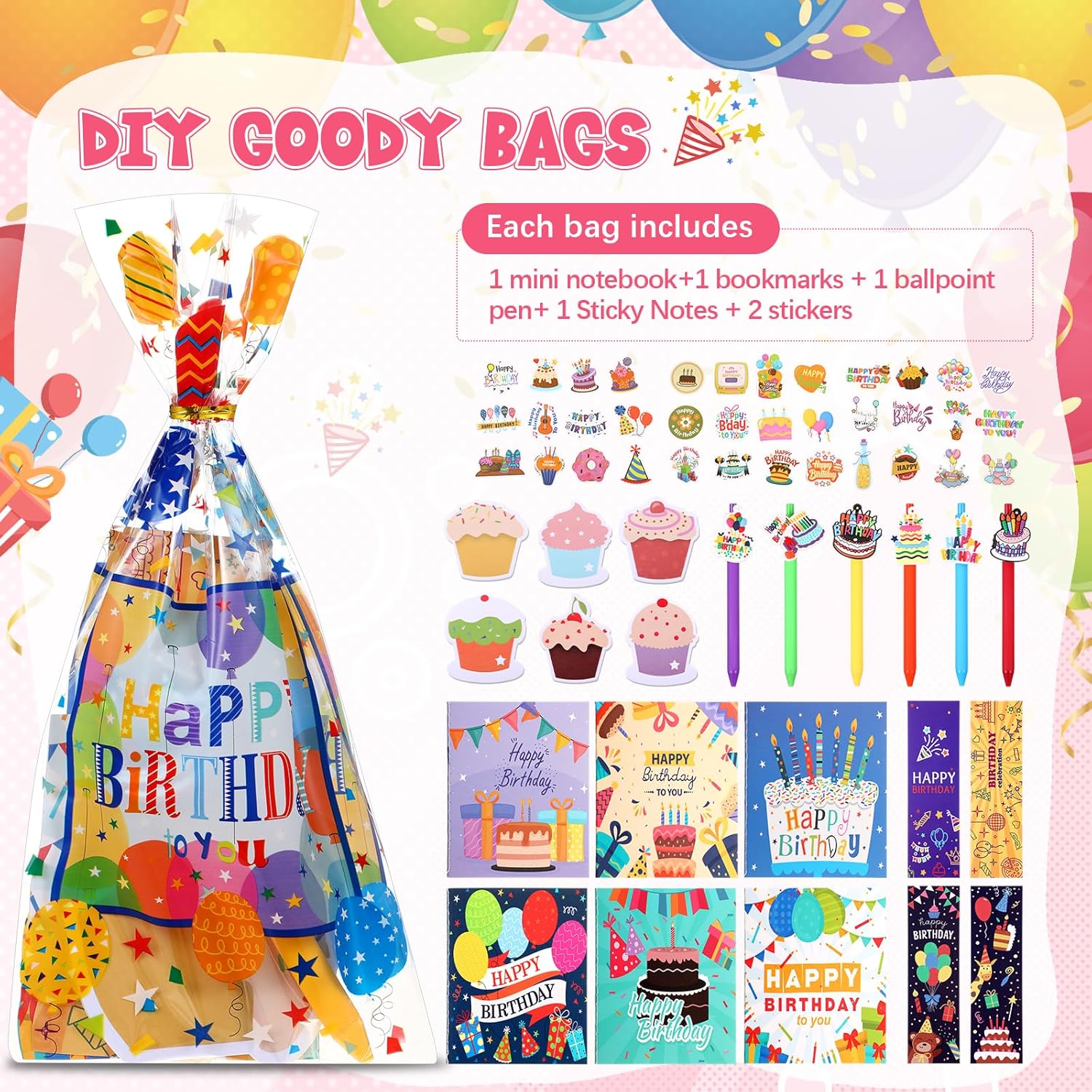Birthday Themed Stationery: you will get a 194 pcs happy birthday stationery set, which includes 24 ballpoint pens, 24 pen clips, 24 notebooks, 24 cupcake sticky notes, 24 cello bags, 24 bookmarks, and 50 stickers, which is enough for you to share with your children or students at a birthday party