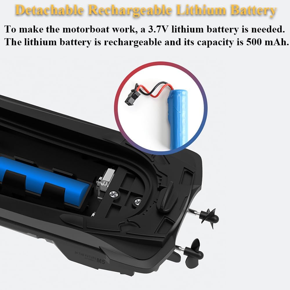 A high-density EVA sponge is placed between the upper part and the lower part of the motorboat, which can effectively avoid the entrance or leakage of water into the battery compartment. Most important, the motherboard, the core part of this toy, is a indepedent sealed module. It adopts the detachable rechargeable lithium battery that lasts about 20 minutes.