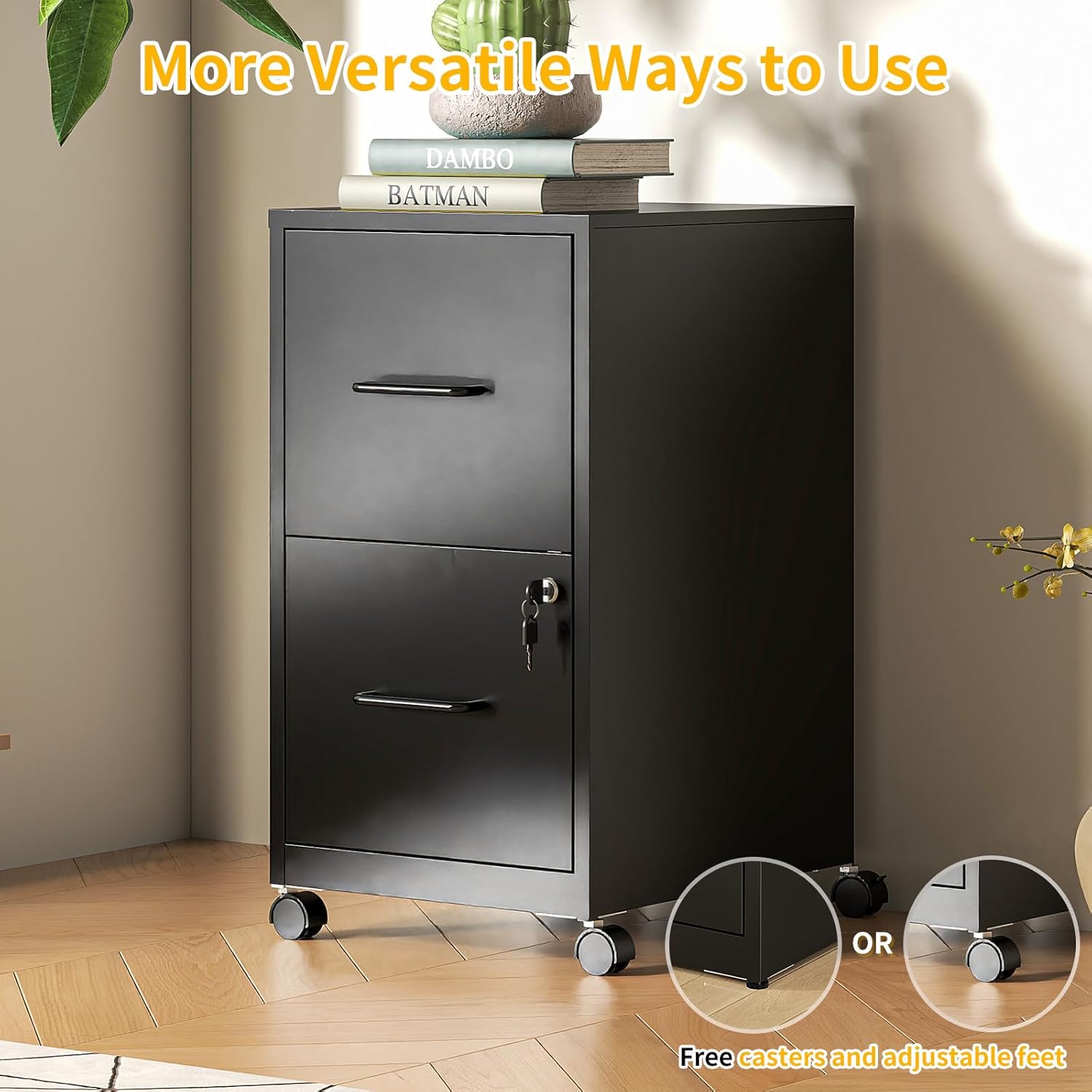 2 Drawer File Cabinet with Lock, Metal Rolling Filing Cabinet with Wheels for Letter/Legal/F4/A4 Size,Lockable Small Under Desk File Storage Cabinets for Home Office Black, Assembly Required