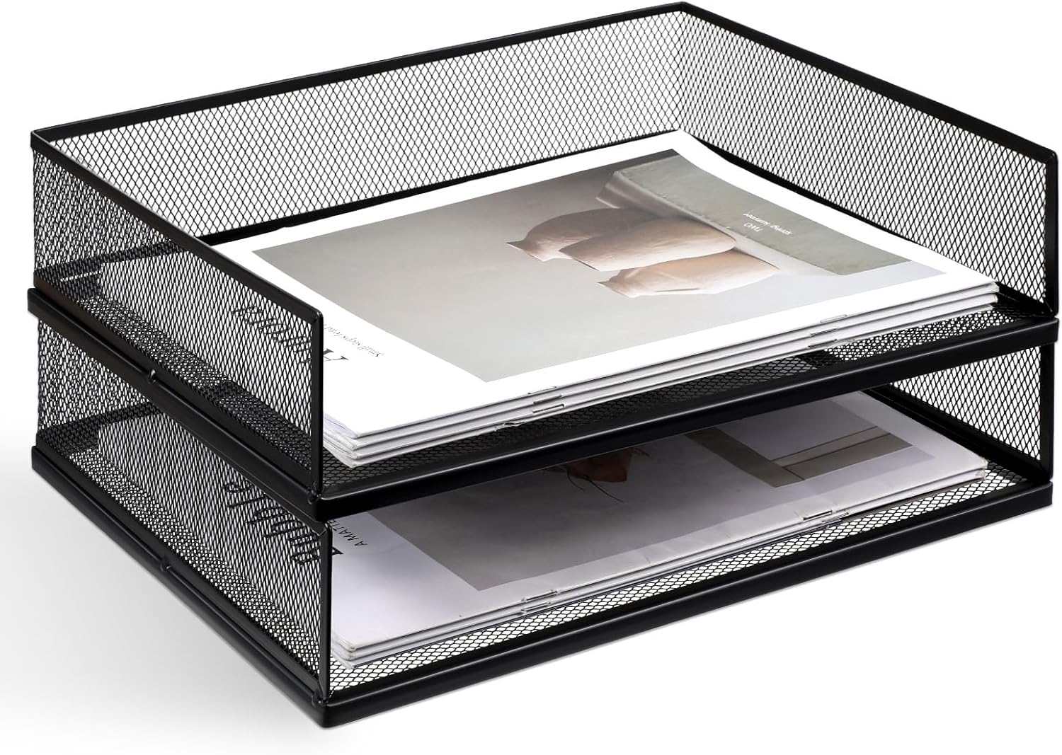 2 Pack Stackable Letter Tray, Wire Mesh Desk File Organizer Metal Desktop Paper Sorter Desk Tray Document Magazine Storage Basket for Home Office Supplies – Transverse Load, Black
