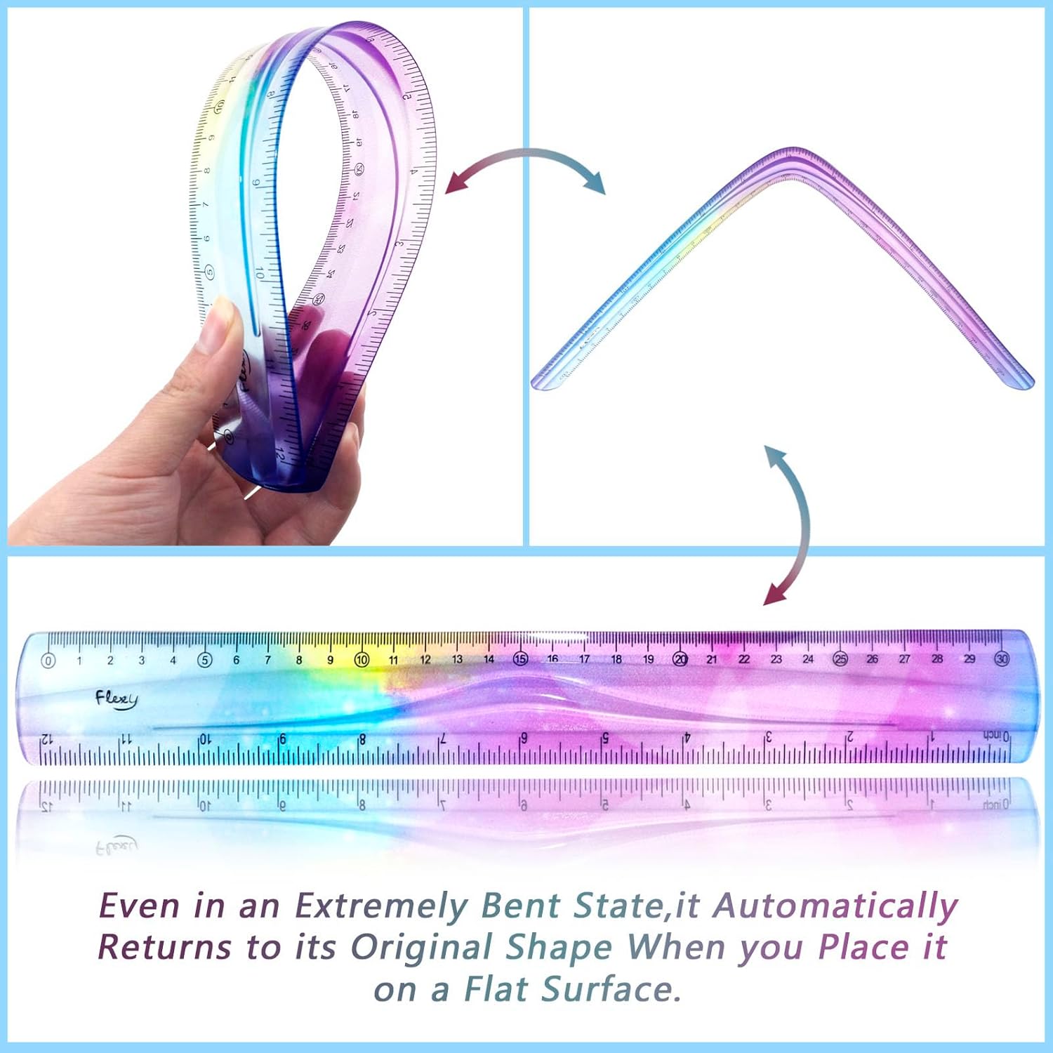 This 12-inch soft bendable ruler (30cm) features a stylish gradient color design with bright colors, perfect for attracting students’ attention and stimulating their interest in learning. The ruler is made of high quality soft PVC material, which is both soft and durable with excellent flexibility and elasticity. It can be easily bent and restored to its original shape after twisting, making it easy to draw straight lines along irregular surfaces, comfortable to the touch and very convenient to use