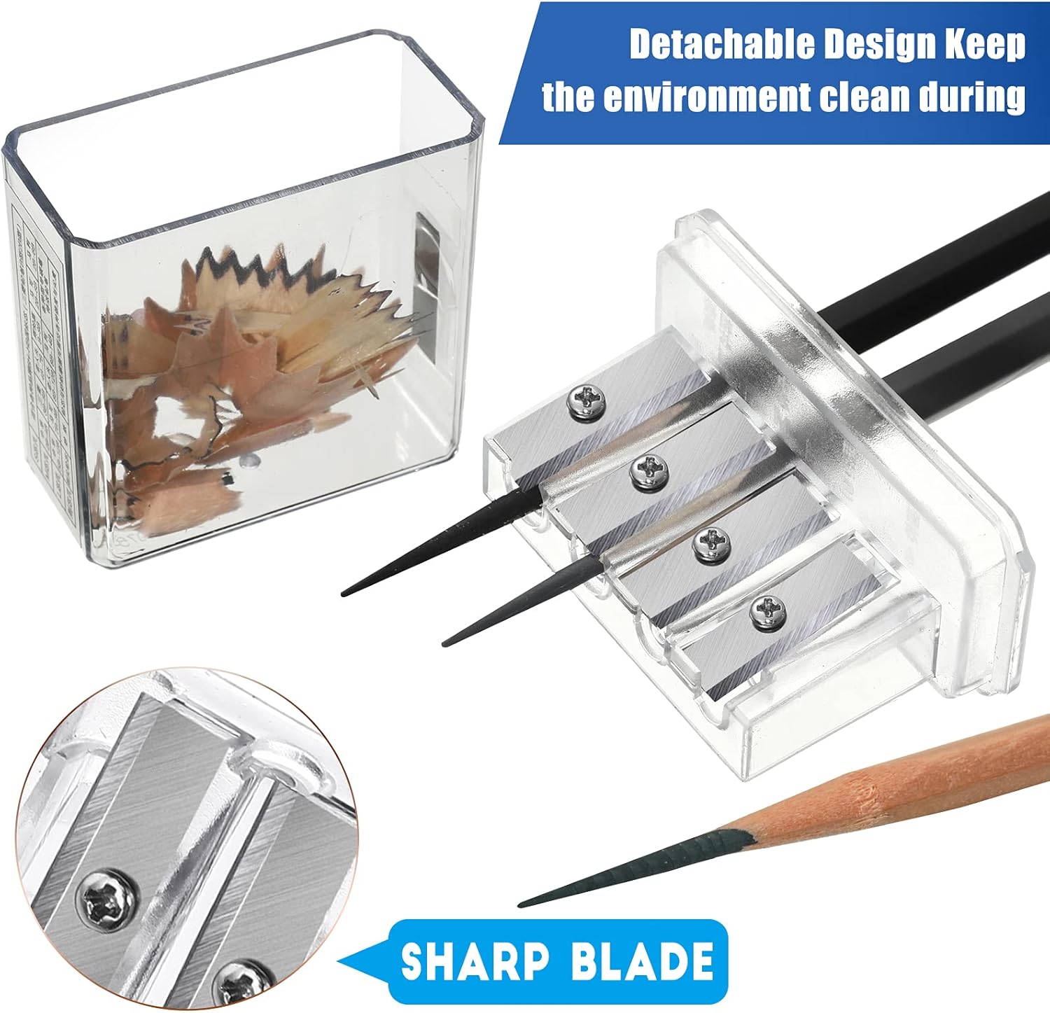 Lid and box: the pencil sharpener equipped with plastic lid and box to protect the blades and store the pencil shavings, keep the environment clean during use