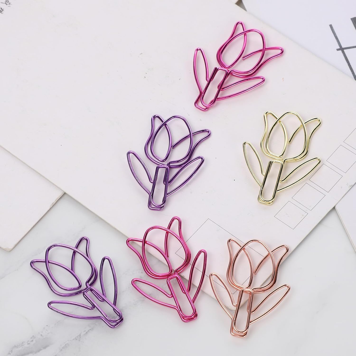 Charming Floral Design: these fancy tulip-shaped paper clips in charming colors like gold, rose gold, pink, and purple add a whimsical touch to office and school supplies, making organizing tasks delightful and fun.
