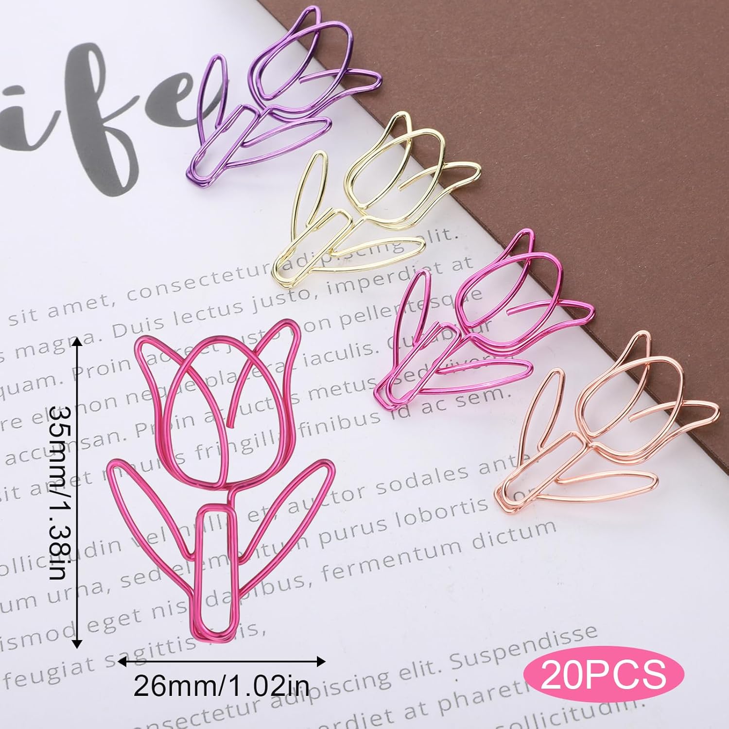 20 PCS Cute Flower Shaped Paper Clips Set, Colorful Metal Flower Shaped Paperclips Floral Papers Clip Tulip Papers Clip Cute-Bookmarks Planner-Clip Cute for School Party Wedding Decor DIY Bookmarks