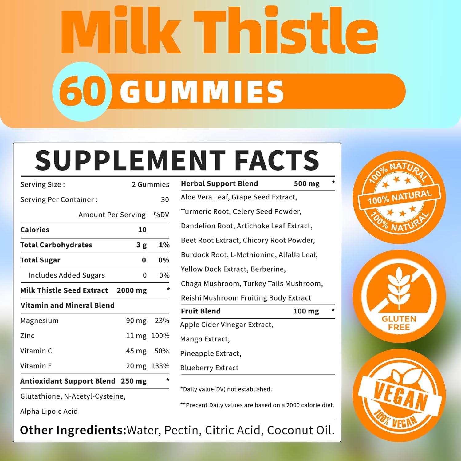 2000 Mg Milk Thistle Gummies – Mango Pineapple – with NAC, Glutathione, Dandelion Root, etc – Gentle Detox* & Cleanse*, Gluten-Free, 60 Count