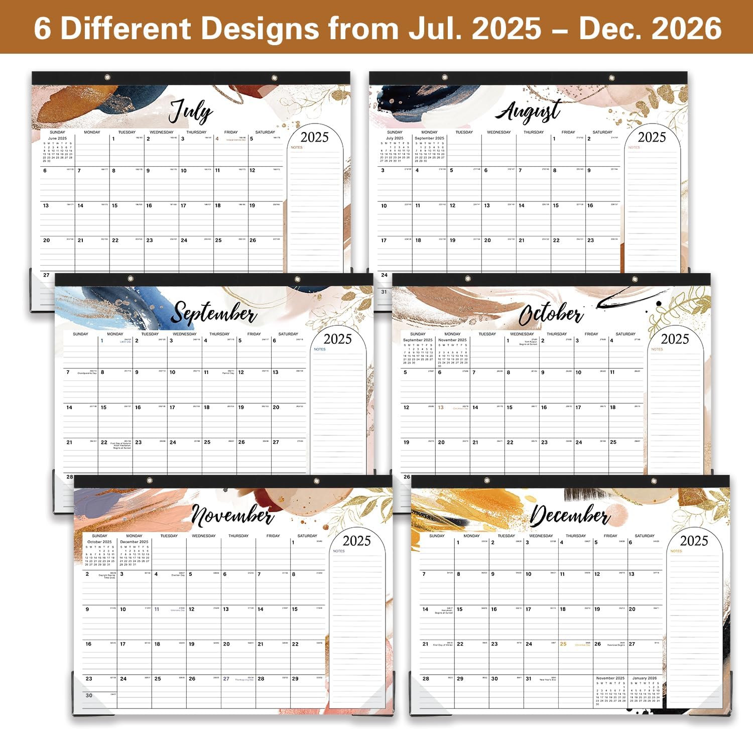 Date: July 2025 – December 2026Page size: 14.6″ x 11.5″ inch.Paper quality: High-quality paper is ink-proof and avoid feathering.Function: Can be used as a desk calendar or hung on the wall as a calendar