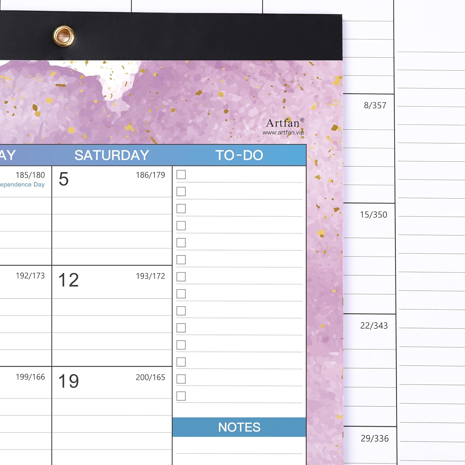 Desk calendar 2025-2026 has a wide, black paper top binding with eyelets for hanging and two black corners keep pages flat during hanging or desktop use. The durable backboard ensures you always have a sturdy writing surface.It is big enough to write down events and deadlines while still fitting comfortably on the desk, the corner tabs at the bottom to prevent the corners of the paper from curling or ripping are a nice touch.