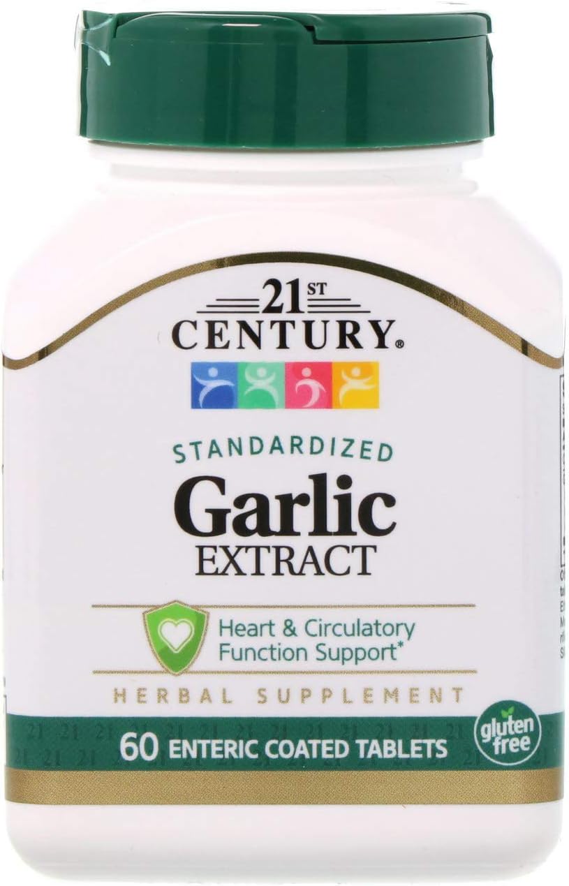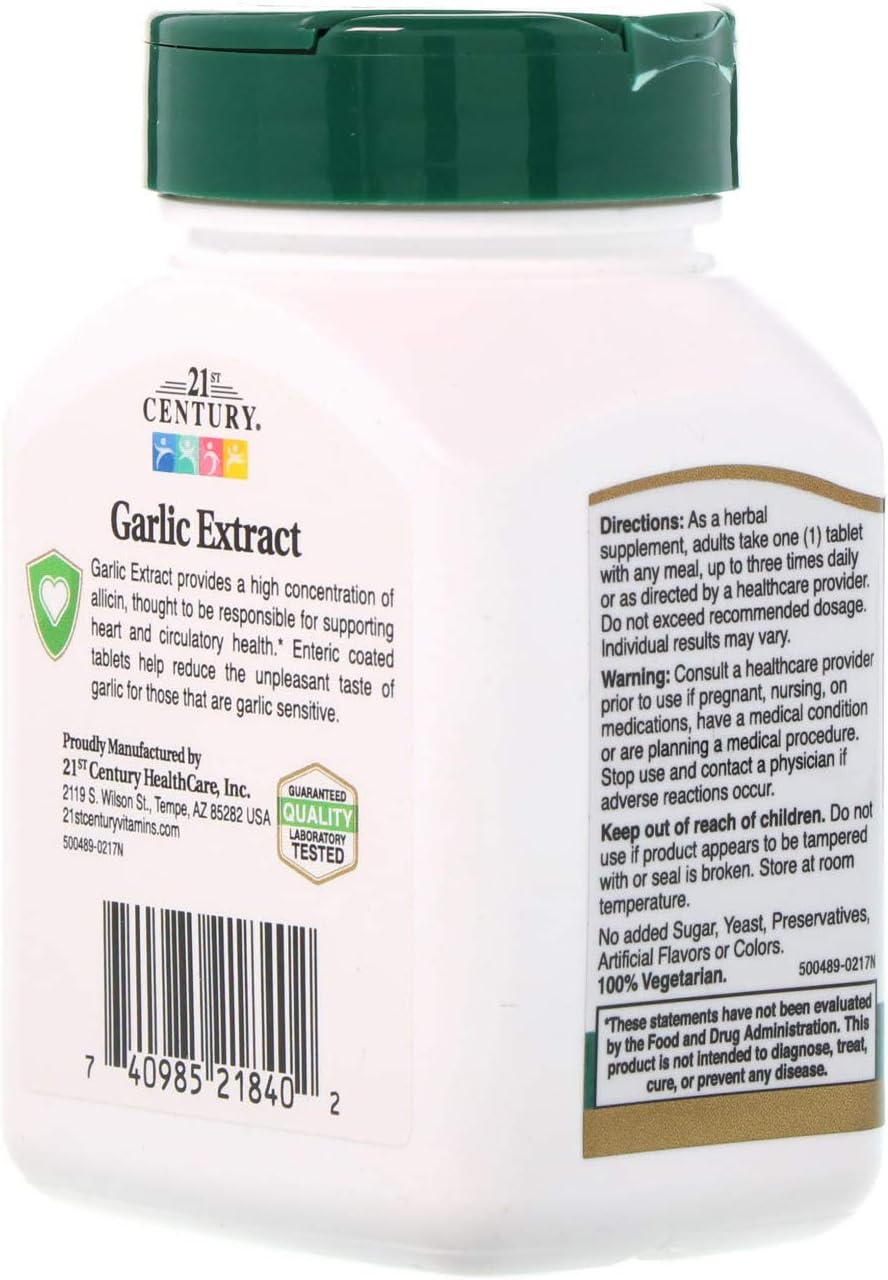Garlic Extract – 60 Coated Tablets Compare Active Ingredients To GarliqueOdor Reduced Formula to Help Maintain Circulatory Efficiency Quantity: 60 Enteric Coated Tablets Description: 21st Century’s Garlic Extract provides a maximum concentrate of allicin yield thought to be responsible for supporting cardiovascular health. 21st Century’s standardized herbal extracts are thoroughly tested to assure specific levels of the important active ingredients are present for maximum benefit. Instructions: Keep out of reach of children. Do not use if product appears to be tampered with or seal is broken. Store at room temperature. For Your Health: Unconditionally guaranteed for purity, freshness and label potency. No Sugar, Salt, Yeast, Preservatives, Artificial Flavors or Colors. Directions: Take up to two (2) coated tablets daily with any meal for maximum daily results, or as directed by a health care provider.100% Vegetarian.