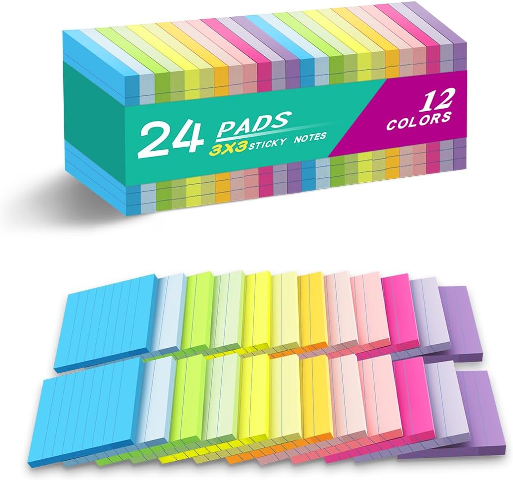 (24 Pads) Lined Sticky Notes 3×3 in Ruled Stickies Super Sticking Power Memo Pads Bright Colors