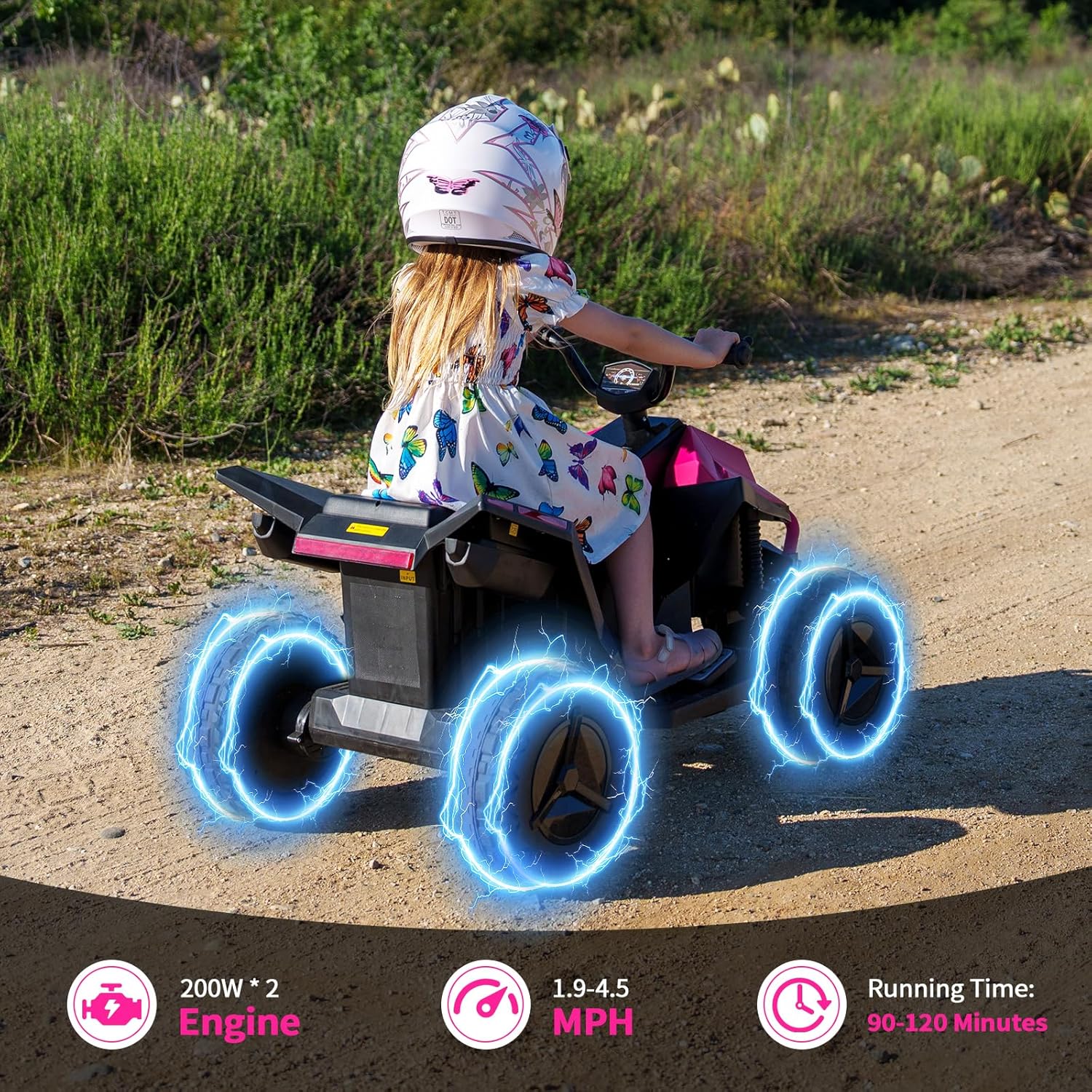 24V 400W Powerful Engine Motor – This kids ride on ATV car is equipped with 24V/2X200W strong motor that can provide more powerful and stable power in any condition. The fast speed is 4.5MPH. Which can provide up to 1.5-2 hours playtime.