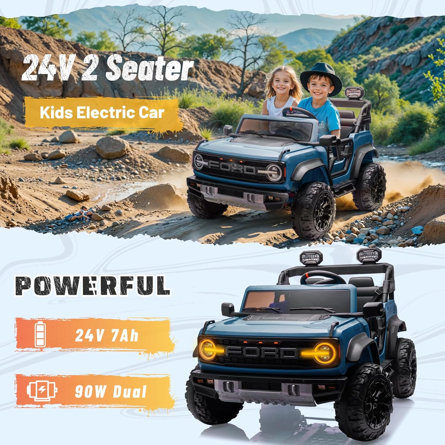 【Ultimate All-Terrain Adventure】: Equipped with four-wheel shock absorption and a sturdy all-terrain off-road design, the Ford Bronco Raptor ride on toy ensures a stable and safe ride for your little explorers, ready to conquer any landscape.