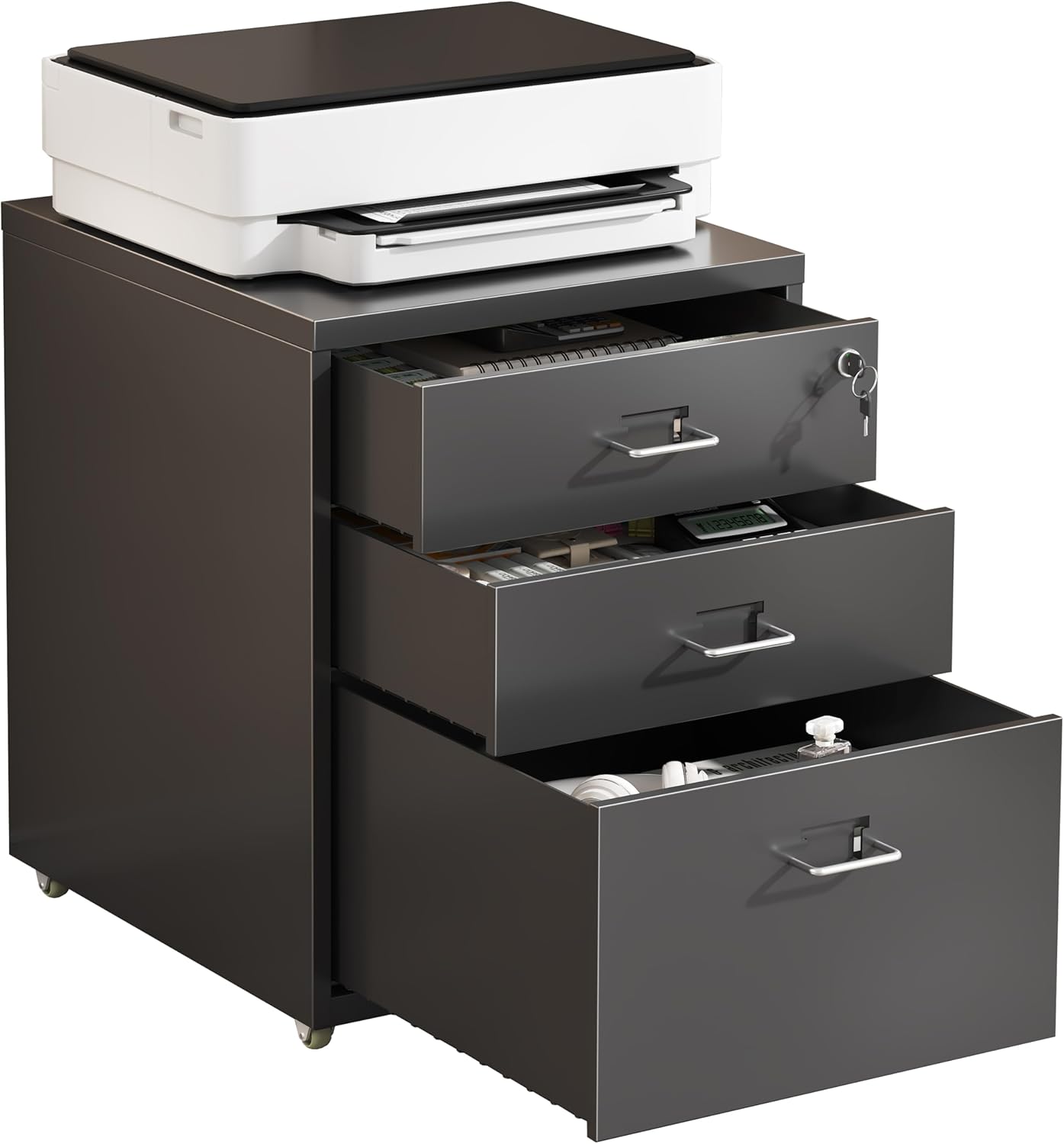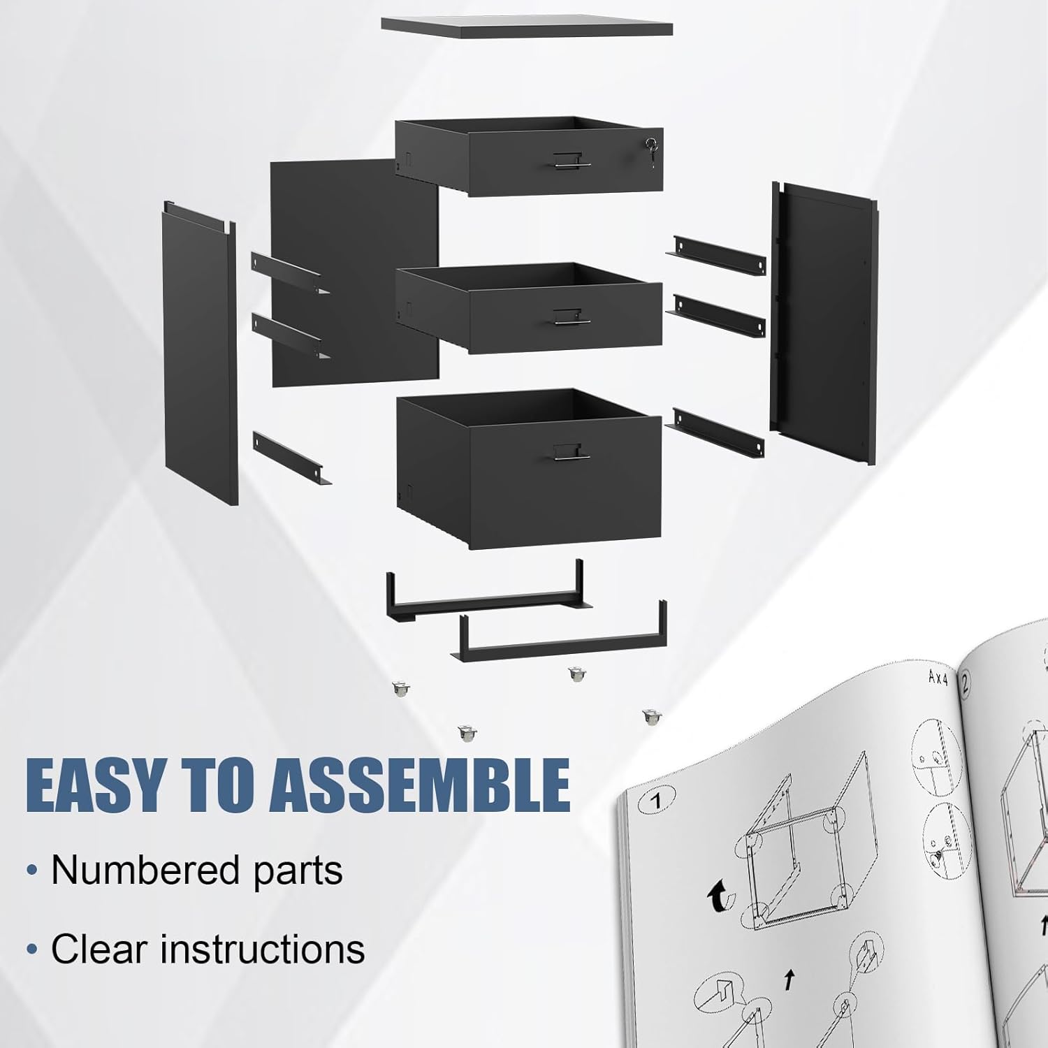 3 Drawer Mobile Cabinet with Lock, Metal Storage Cabinets for Home Office, Under Desk Cabinets with Drawers, Mobile File Cabinet, Assemble Required, Black