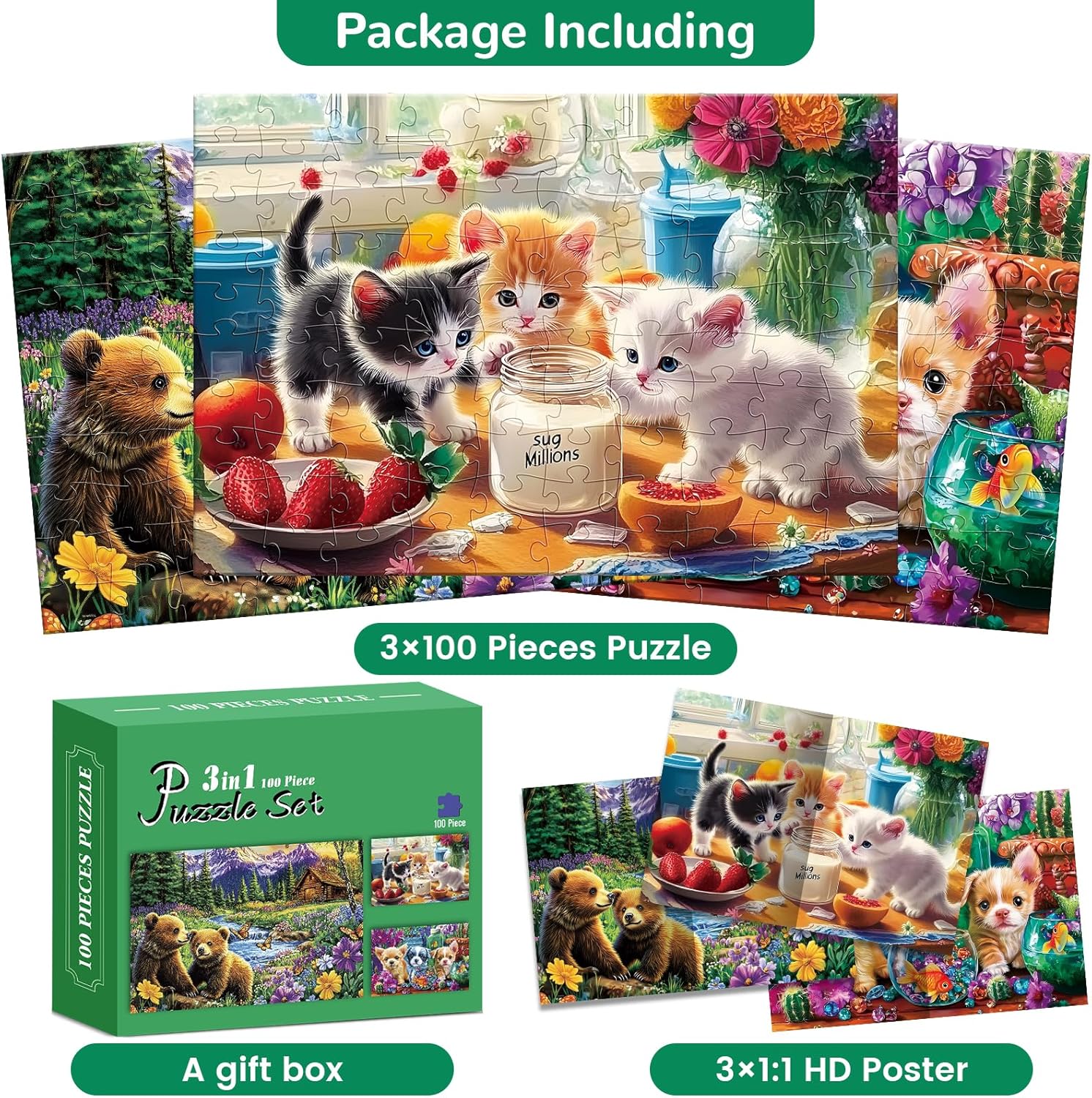 🐾 Bears, Kittens & Puppies 100 Piece Puzzle– A Cozy World of Wonder – From peaceful forest strolls to playful kitchen moments, this puzzle captures the gentle joy of animals at home and in nature. Let every piece bring a smile.