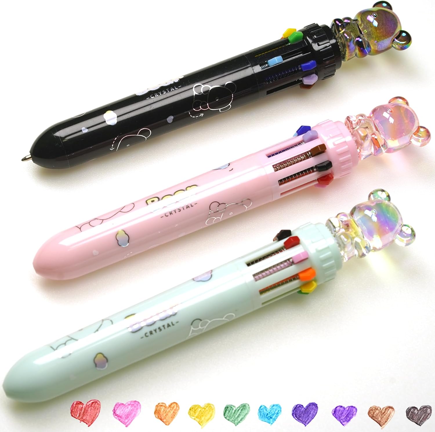 Fun & colorful multi color pens all in one:This set of 3 crystal bear multicolored pens includes pink, black, and light blue designs. Each pen combines 10 vibrant ink colors, perfect for creative projects, note-taking, and more