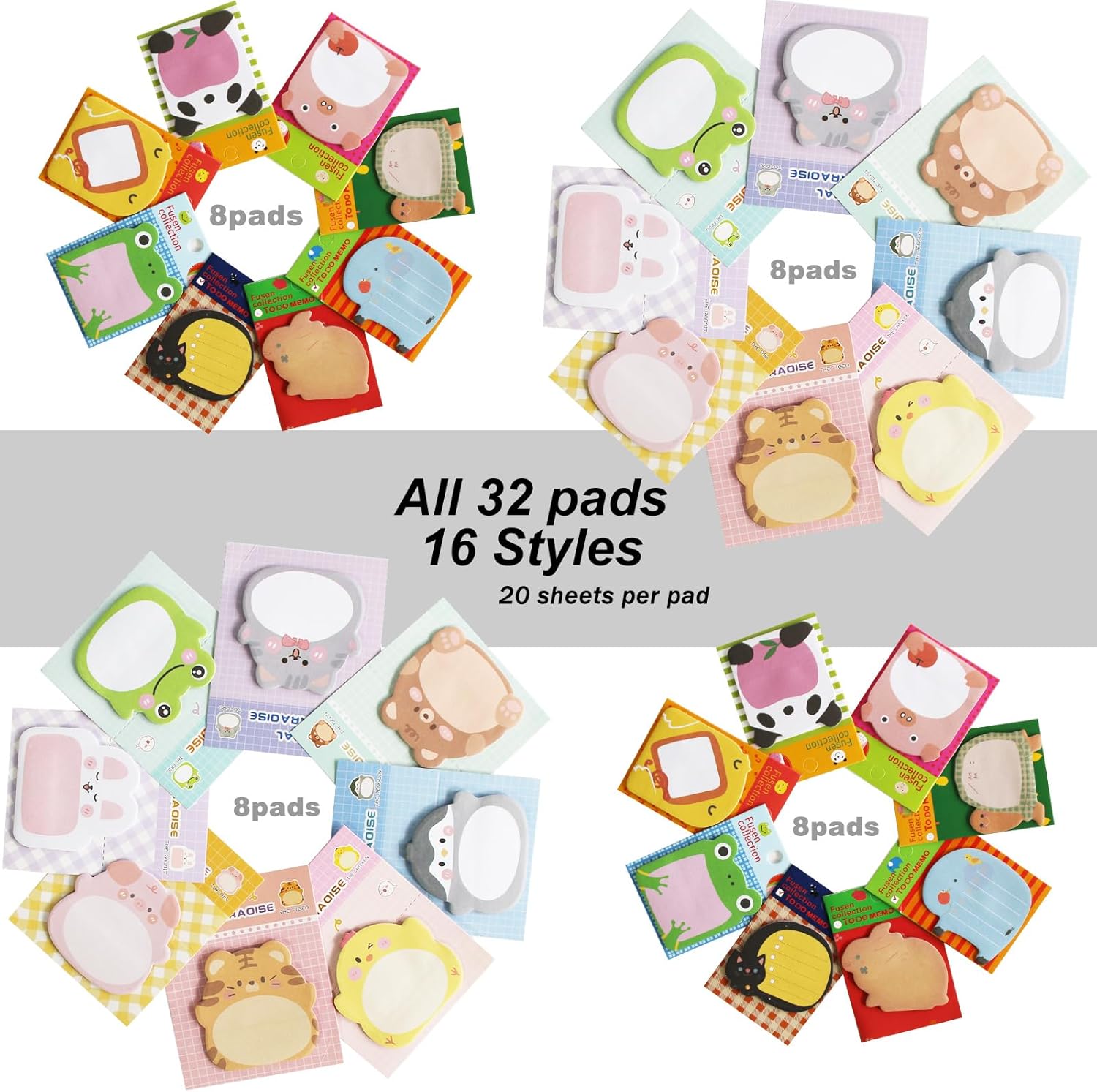 32 Pads Cute Sticky Notes, Animal Sticky Notes Self Adhesive Cartoon Notes Memo Pads Notes Page School Tab for School Office Supplies