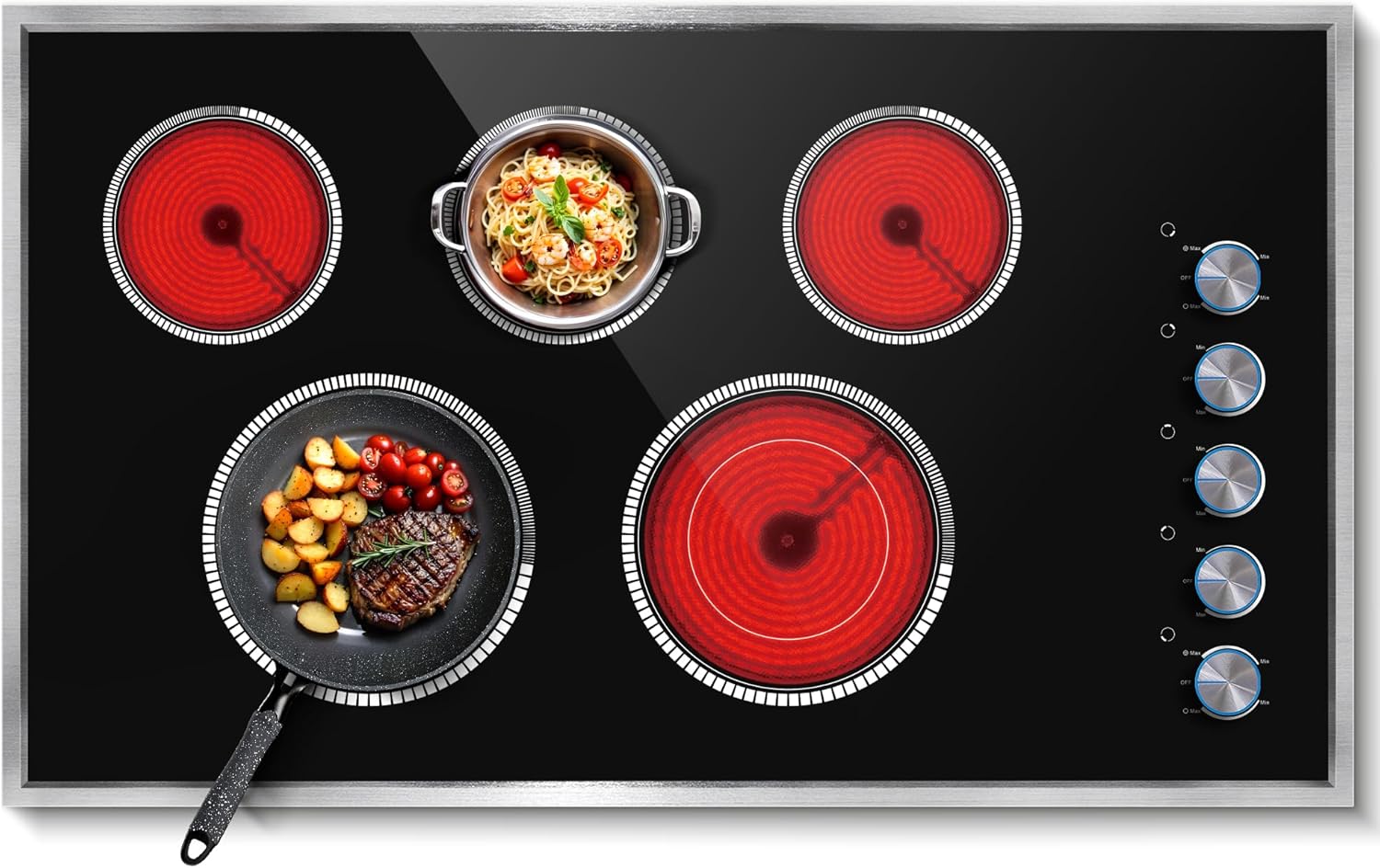 36 Inch Electric Cooktop, 5 Burner Electric Stove Top 8400W, 36″ Ceramic Stove with Knob Control, Over-Temperature Protection, Dual Ring Zone, 220-240V Hard Wired (No Plug)