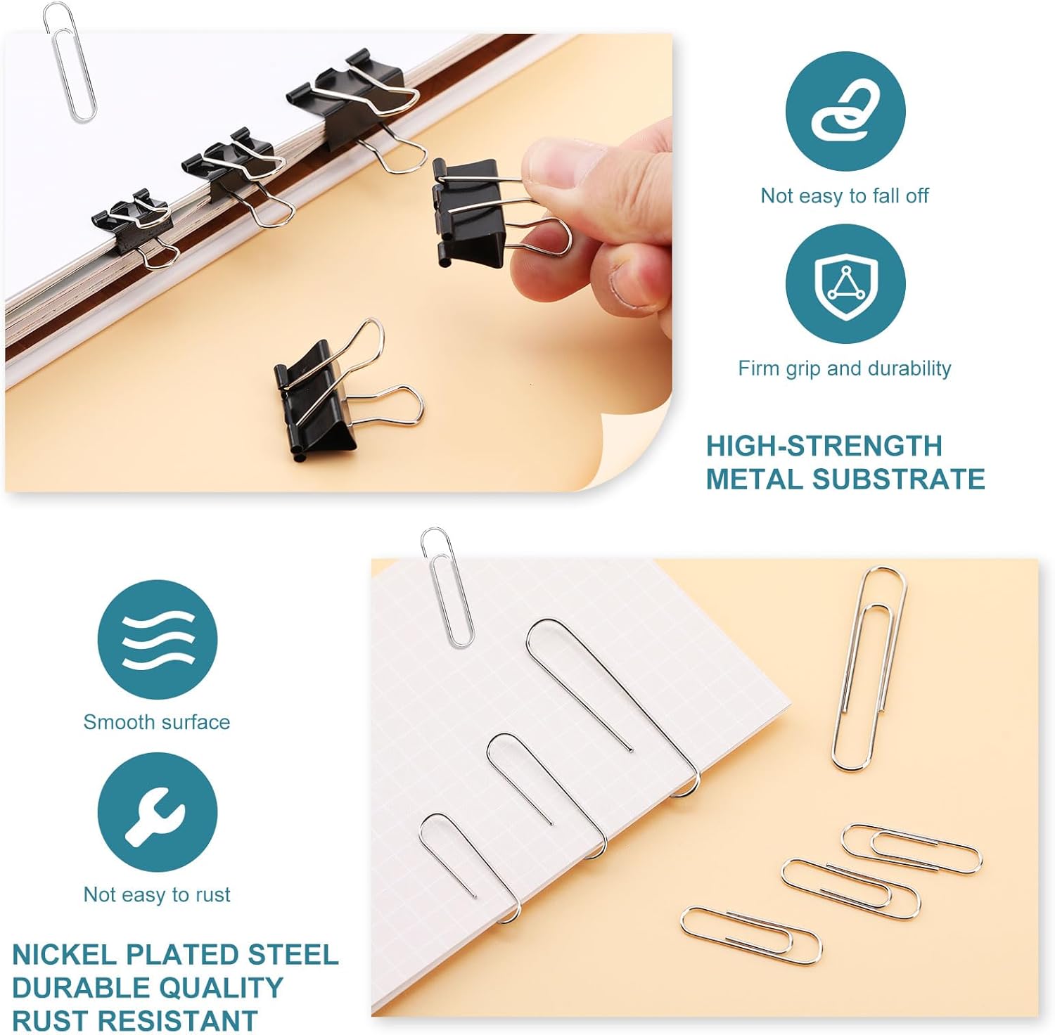Both the paper clips and binder clips feature a user-friendly design, Crafted from a high-strength metal substrate with a smooth surface, Gentle on Paper and Hands.preventing snags and tears while maintaining the integrity of your documents.