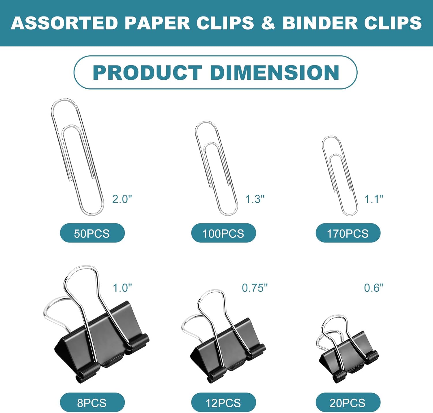 Assorted Sizes binder clips & paper clips are perfect for bookmarks, document organization, cable management, and creative projects. Exquisite office supplies are ideal for home, school or office use.