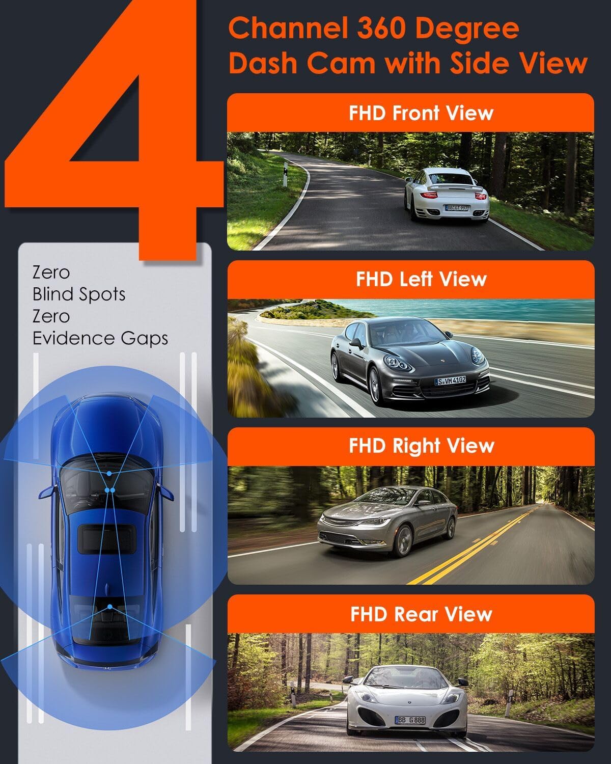 4-Channel 360-Degree Coverage with No Blind Spots: The Vroavie dash cam provides complete 360-degree coverage, eliminating concerns about side scratches or hit-and-run incidents. It features four HD wide-angle lenses, each with a 170-degree field of view, allowing the four cameras to simultaneously capture images from the front, back, left, and right sides of the vehicle.