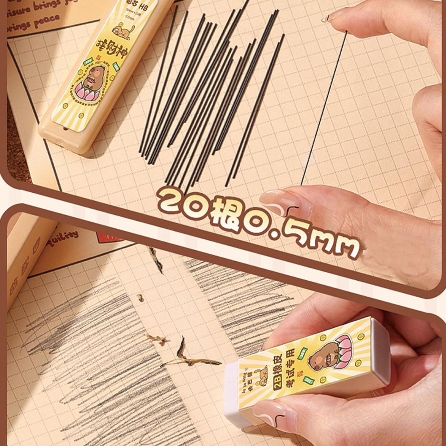 Cute Mechanical Pencils: The cute capybara pencil set includes 4 pieces 0.5mm mechanical pencil + 1 piece refill +1 piece eraser. The cute pencils are made of plastic. Nice Pencil Set for girl boy women men.