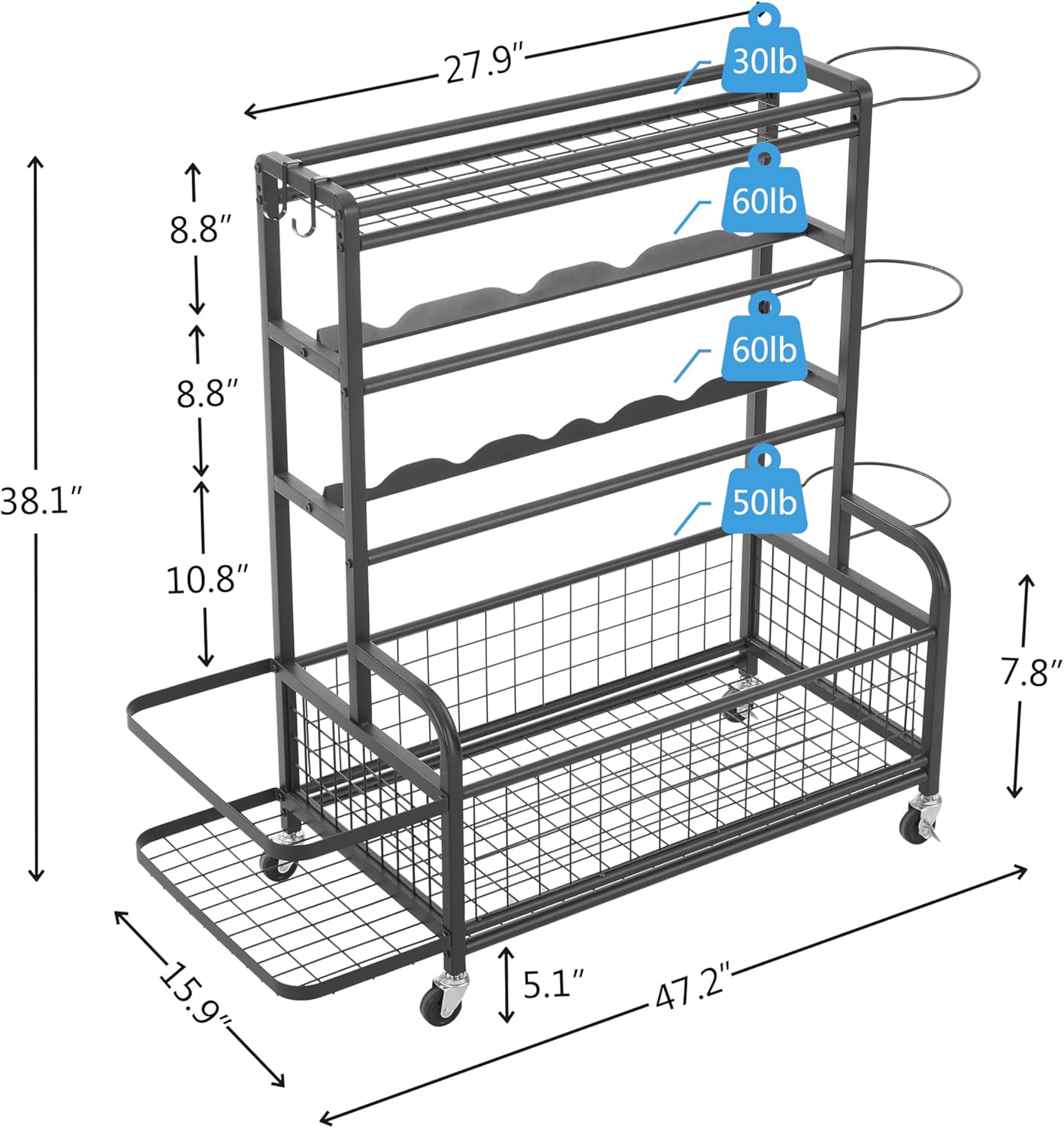 Large Capacity: this 4-tier metal sports equipment organizer offers ample space for all your gear, making it the perfect garage ball storage solution. with multiple shelves, you can efficiently store and organize balls, bats, and other sports accessories.