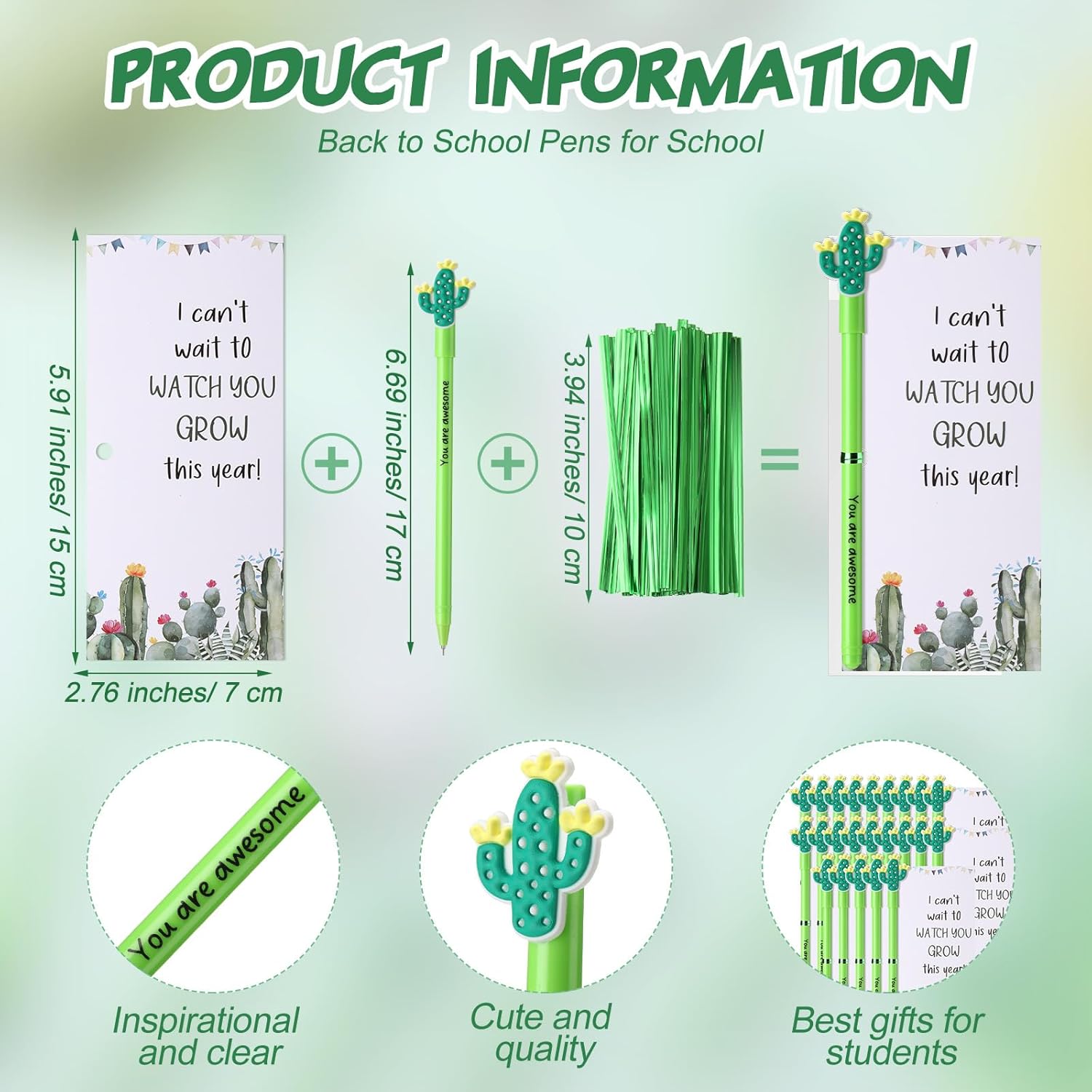 50 Sets Back to School Gifts for Classroom Cactus Ballpoint Pens Inspirational Roller Pens First Day of School Cards with Plastic Ties Stationery Supplies