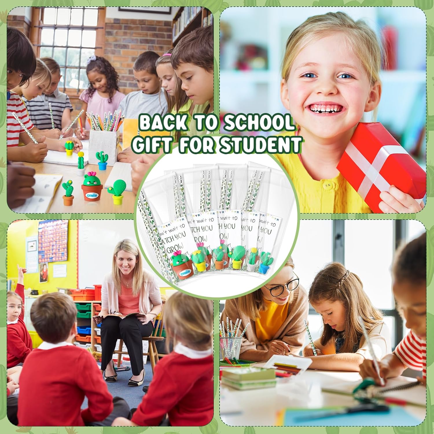 50 Sets Cactus Back to School Gifts for Student Cactus Pencil Succulent Eraser Succulent Potted Pencil Sharpener Card Bags First Day of School Gifts for Classroom Rewards Stationery Supplies