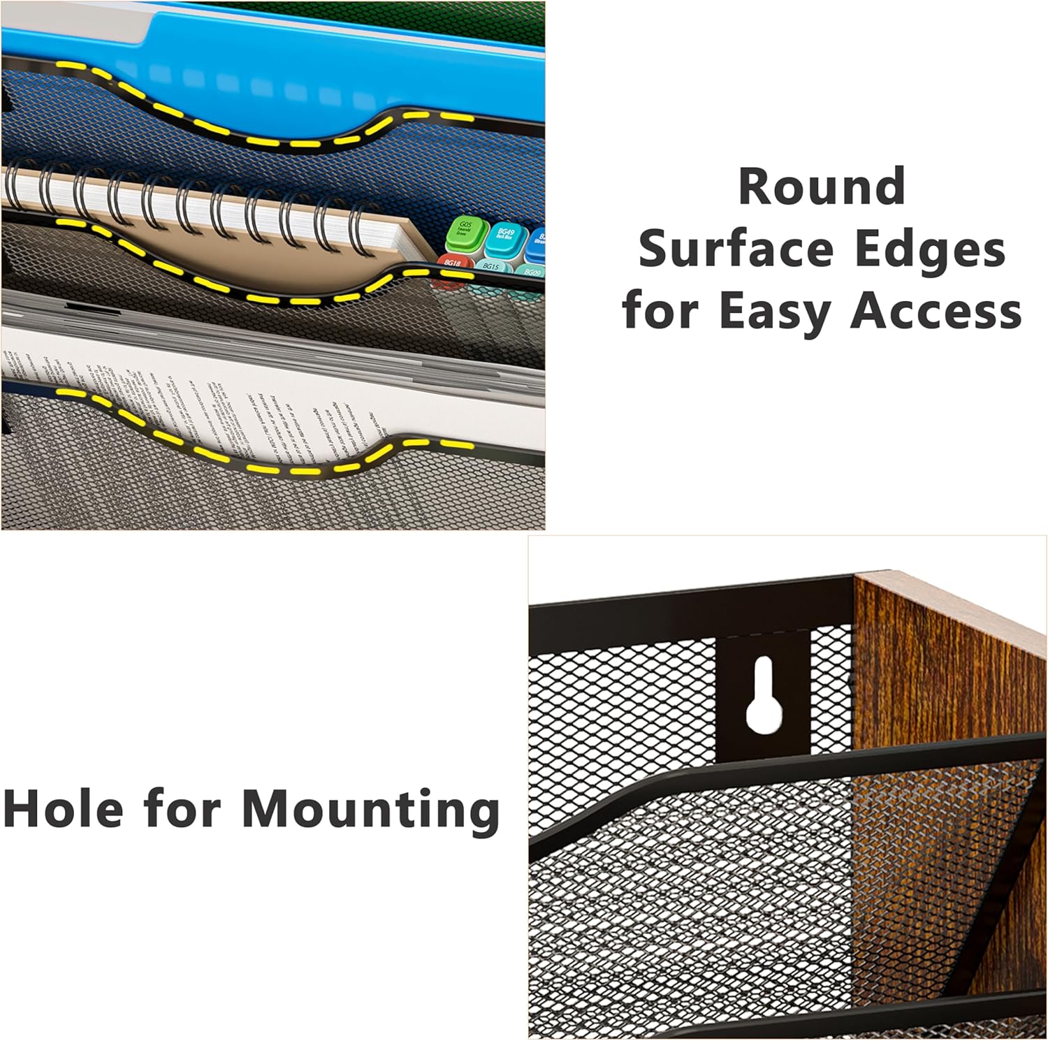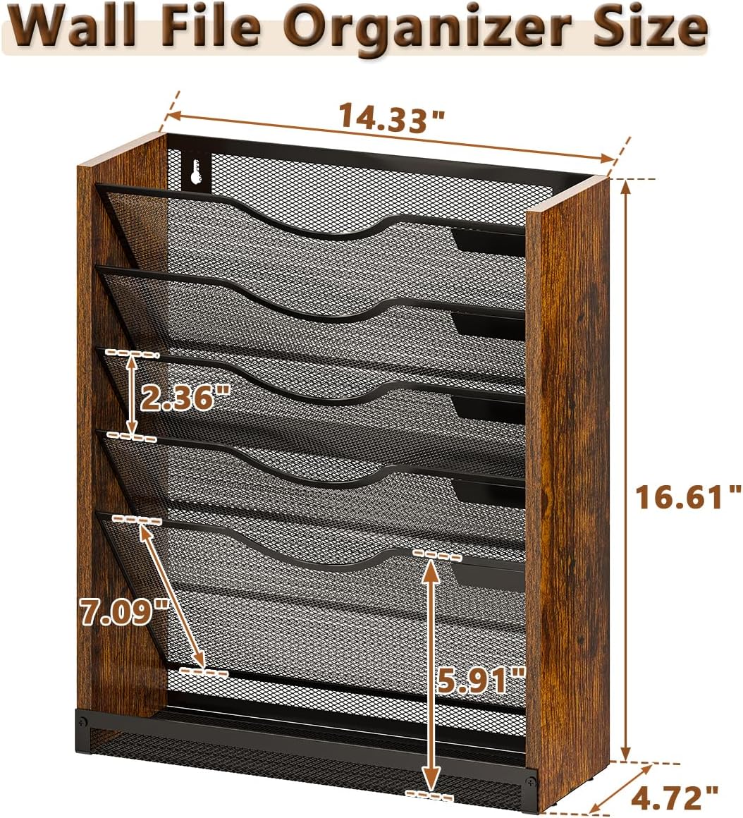 6-Tier Wall File Organizer with Bottom Tray, Ironwood Mail Organizer Wall Mounted with Metal Mesh, Document Organizer for Paper, Folder, Magazine, Office Desk Accessories for Home Cubicle Countertop