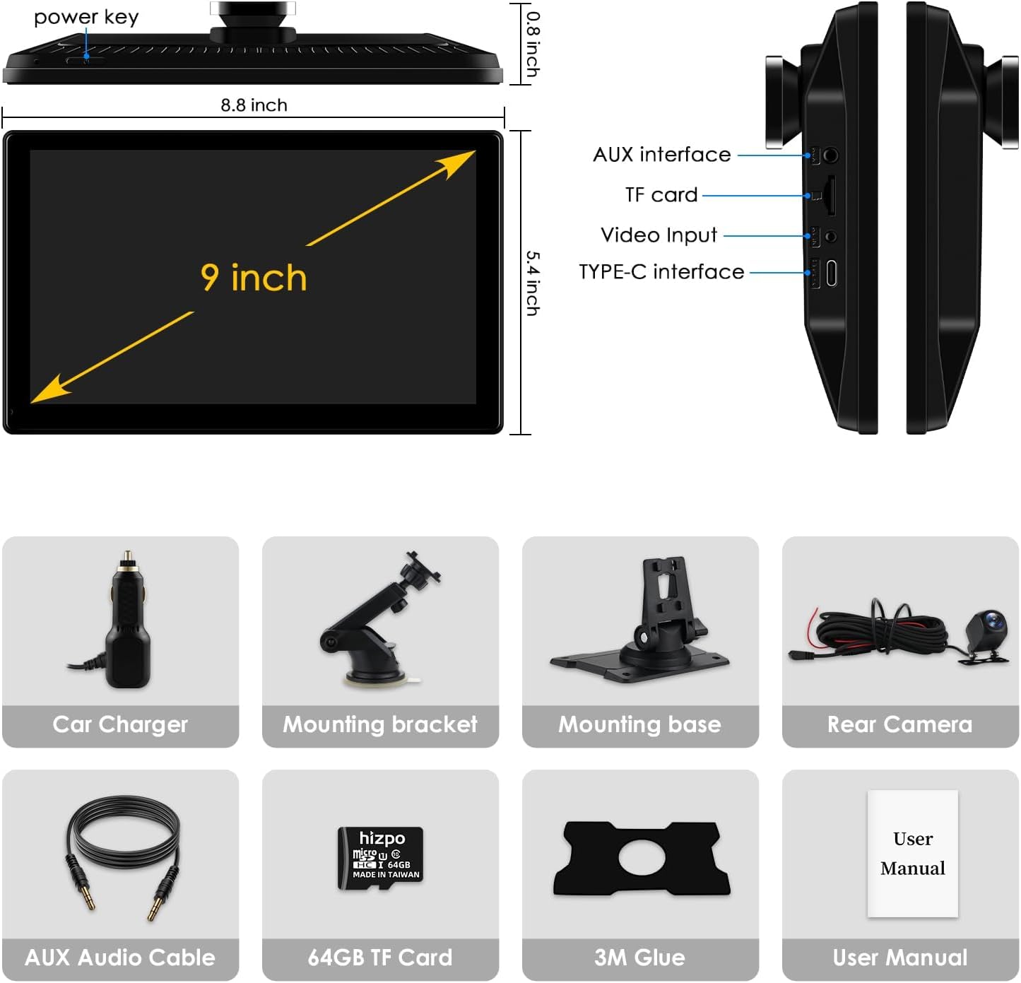 9″ Carplay Screen for Car, Portable Car Stereo with Wireless Carplay & Android Auto, 4K Dash Cam, 1080P Camera, GPS Navigation, Voice Control,Portable Car Radio with 64GB SD Card AHD Rear Camera