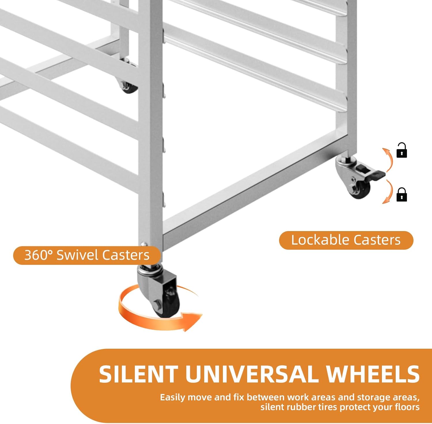 Rolls Smoothly, Locks Securely:With 4 heavy-duty casters (2 lockable), you can easily glide the bakery rack around the kitchen. Safely move hot trays, or brake for stability during loading – a game changer for using a bakery rack on wheels in tight spaces. Say goodbye to back strain!