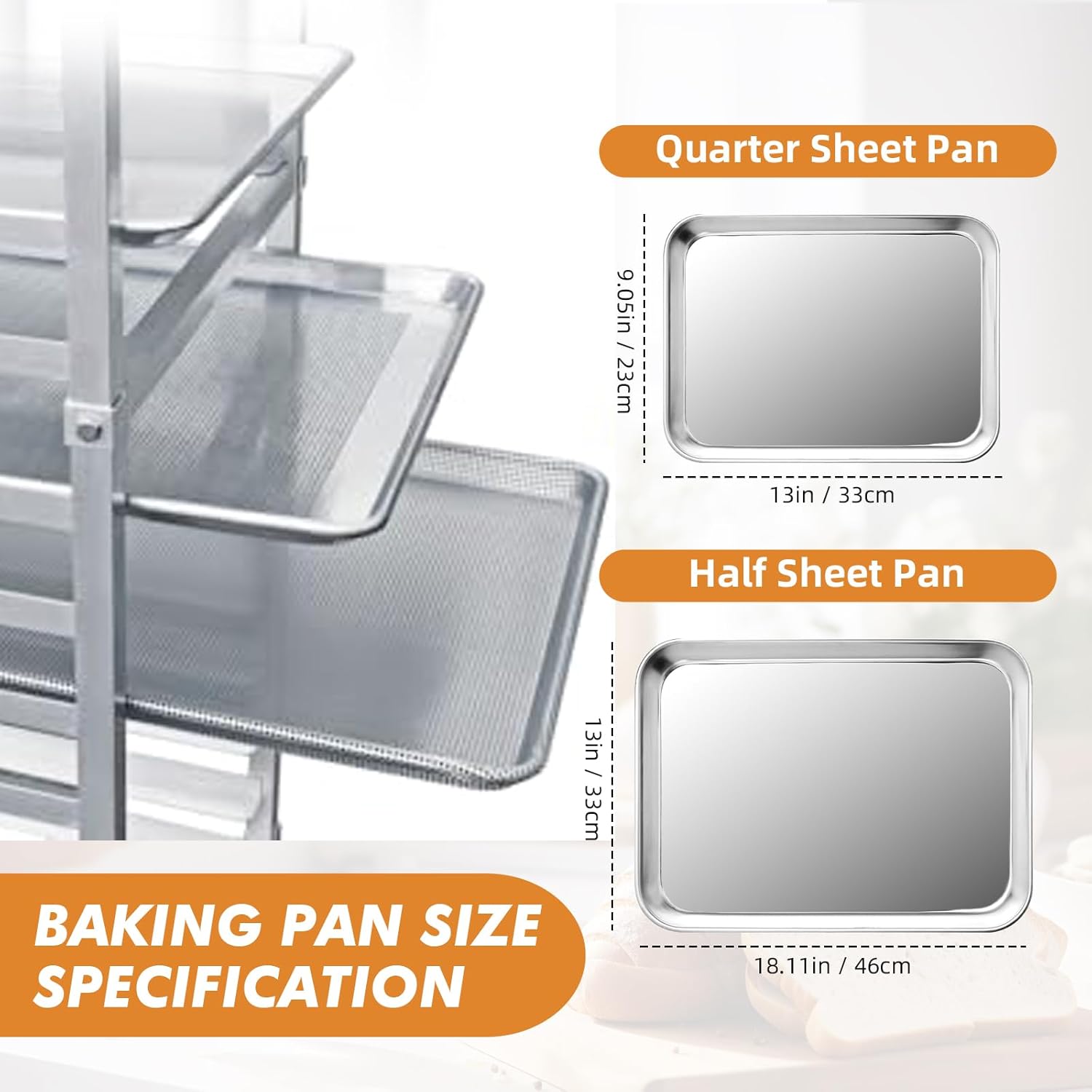 DURABLE: Applicable baking pan size: Quarter Sheet Pan (1/4 Bun Pan) Bun Pan size: 9in*13in (230mm*330mm) Half Sheet Pan (1/2 Bun Pan) Bun Pan size: 13in*18in (330mm*460mm)