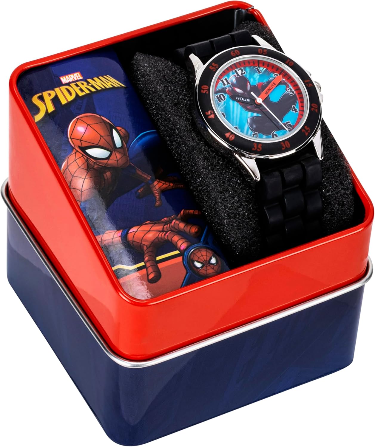 Unleash the power of time-telling with the exclusive Accutime Marvel Spider-Man Miles Morales Time Teacher Watch, designed specifically for young fans of the dynamic superhero. This watch is not just a tool to tell time; it is an adventure on the wrist that brings the exciting world of Spider-Man into the daily life of your child. Featuring a vibrant dial adorned with Miles Morales, the Spider-Man of a parallel universe, this watch captivates with its bold colors and clear, educational layout. The watch face is specifically designed to aid in teaching time, with every element crafted to support young learners. The “Hour” and “Minute” hands are distinctly labeled to provide easy identification, helping children understand the concept of time more intuitively. Built for the rough and tumble of kid’s play, the watch showcases a durable metal case that stands up to the challenges of active use. The comfortable black silicone strap ensures a snug fit on little wrists, making it ideal for everyday wear. A secure buckle clasp guarantees that the watch stays in place, whether at school, play, or during superhero adventures. The excitement goes beyond just wearing the watch—each timepiece comes packaged in a beautifully designed collectible tin that features iconic Spider-Man imagery, making it a perfect gift for any occasion. Inside, the watch nestles securely, ready to be unwrapped by eager young fans. This collectible case not only serves as a delightful gift box but also doubles as a keepsake where children can store their treasured watch, or other Spider-Man memorabilia. Enhancing the experience, this watch is equipped with a quartz movement, ensuring precise and reliable timekeeping. This practical functionality is paired with the educational aspect of the watch, making it a valuable tool for children learning to read time.