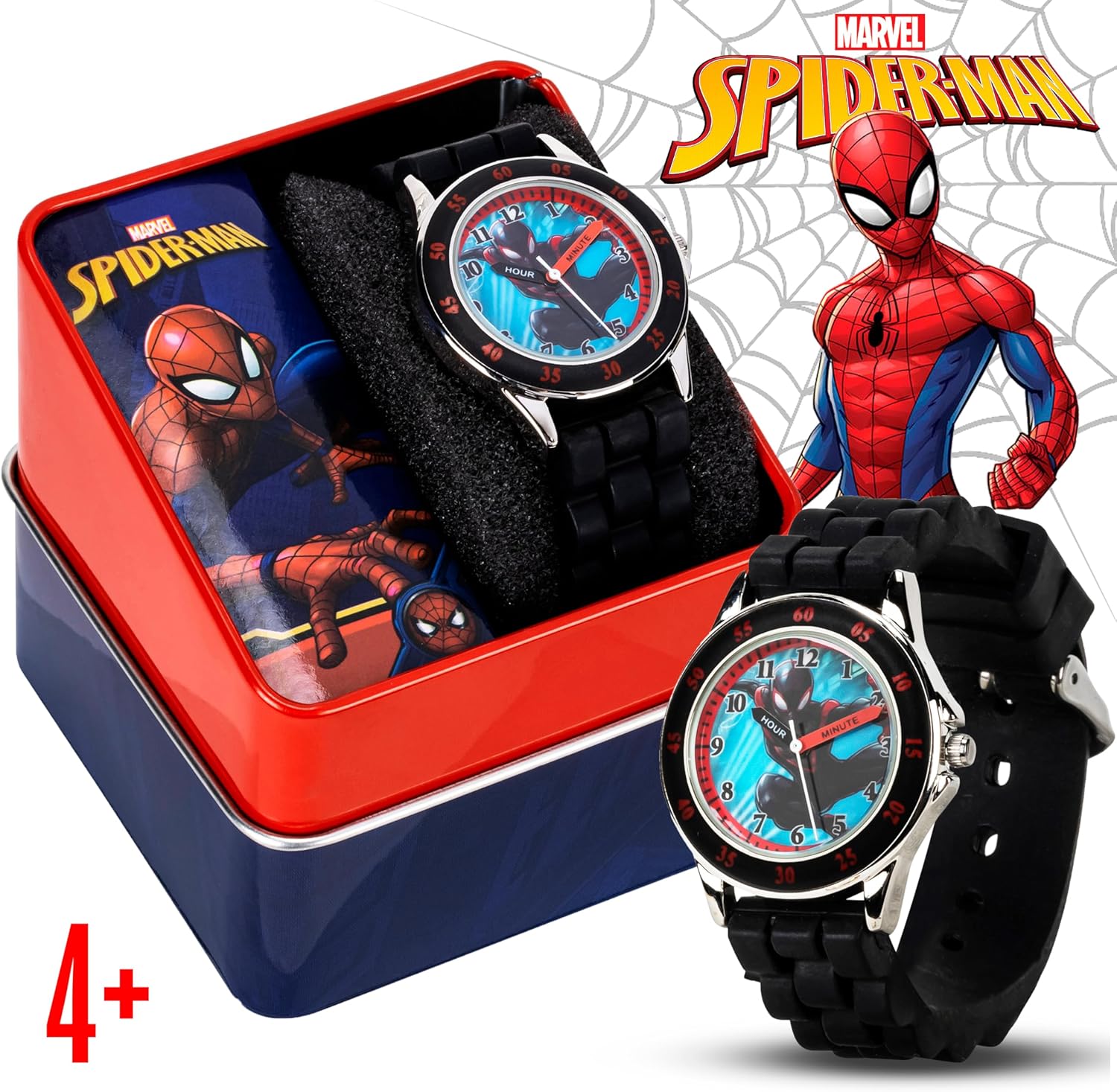 Unleash the power of time-telling with the exclusive Accutime Marvel Spider-Man Miles Morales Time Teacher Watch, designed specifically for young fans of the dynamic superhero. This watch is not just a tool to tell time; it is an adventure on the wrist that brings the exciting world of Spider-Man into the daily life of your child. Featuring a vibrant dial adorned with Miles Morales, the Spider-Man of a parallel universe, this watch captivates with its bold colors and clear, educational layout. The watch face is specifically designed to aid in teaching time, with every element crafted to support young learners. The “Hour” and “Minute” hands are distinctly labeled to provide easy identification, helping children understand the concept of time more intuitively. Built for the rough and tumble of kid’s play, the watch showcases a durable metal case that stands up to the challenges of active use. The comfortable black silicone strap ensures a snug fit on little wrists, making it ideal for everyday wear. A secure buckle clasp guarantees that the watch stays in place, whether at school, play, or during superhero adventures. The excitement goes beyond just wearing the watch—each timepiece comes packaged in a beautifully designed collectible tin that features iconic Spider-Man imagery, making it a perfect gift for any occasion. Inside, the watch nestles securely, ready to be unwrapped by eager young fans. This collectible case not only serves as a delightful gift box but also doubles as a keepsake where children can store their treasured watch, or other Spider-Man memorabilia. Enhancing the experience, this watch is equipped with a quartz movement, ensuring precise and reliable timekeeping. This practical functionality is paired with the educational aspect of the watch, making it a valuable tool for children learning to read time.