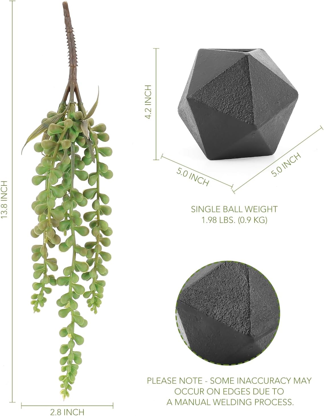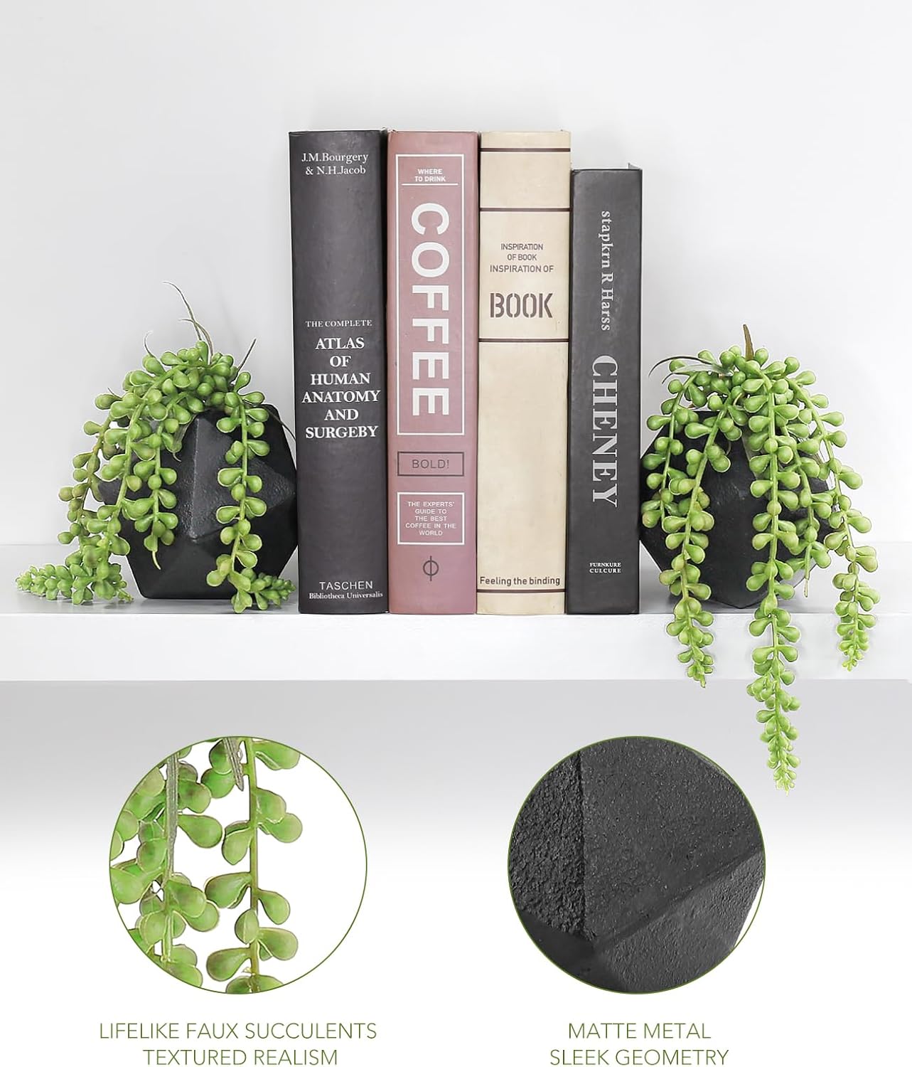 Bookends Decorative with Sculptural Geometric Design – This pair of stylish heavy bookends features lifelike faux string of pearls nestled in spherical black metal planters with a bold geometric form—bringing a modern, sculptural touch of greenery to any bookshelf or reading corner.