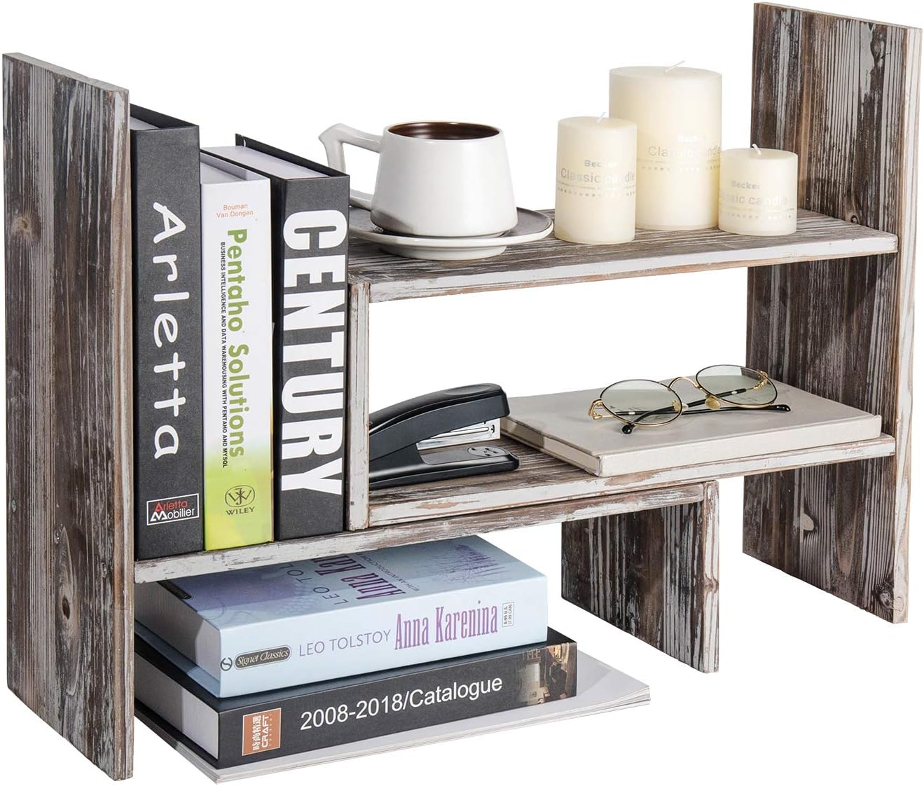 Use this adjustable rack to add professionalism and décor to any place you desire. It is perfect for organizing your documents, notes, stationery, office necessities, make-up products, and small decorations. It is also great for showcasing your artwork, photos, keepsakes, collection of books, and cherished items. This counter-top shelf even comes in handy in the kitchen by keeping spice and cooking gear in place.