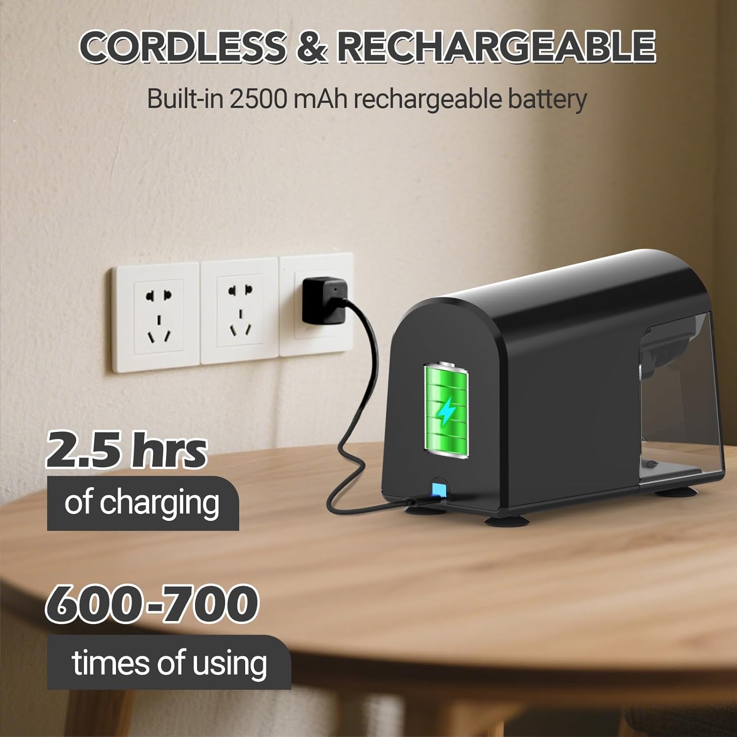 【Rechargeable Pencil Sharpener: 600-700 Sharpenings on a Full Charge】With built-in 2500 mAh lithium battery, this pencil sharpener can be recharged and reused, and used anywhere, indoor and outdoor. To charge the sharpener, connect the USB cable to a 5V 2A adapter. (The output should not be over 5V) Thanks to the large battery capacity, it can handle up to 600-700 pencil sharpenings on a full charge. Only takes about 2.5 hours to fully charge, it can meet the usage needs for several weeks.