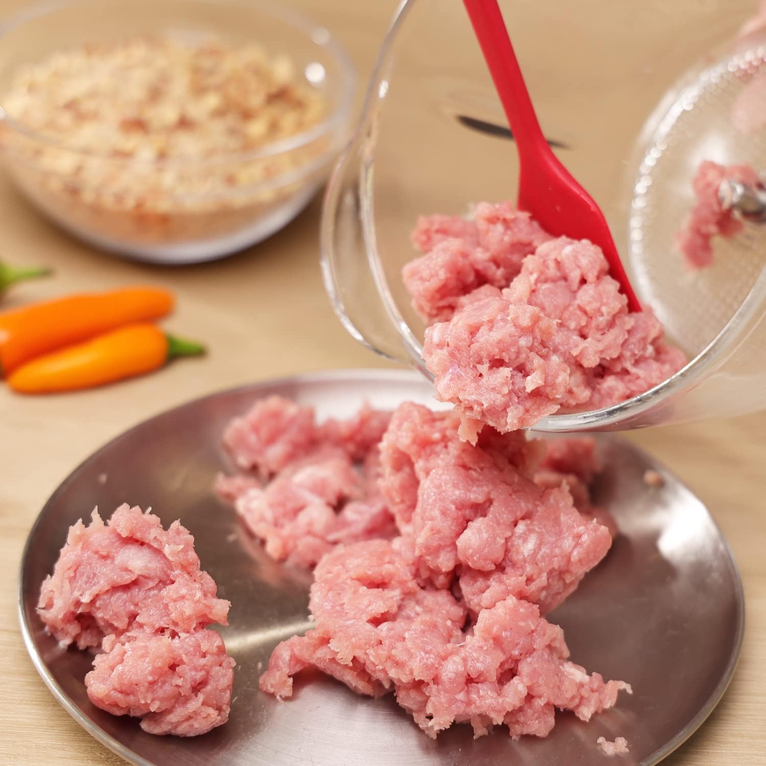 🥣【USER SAFETY DESIGN】 1. The blade protective case prevents your fingers from being cut. You only need to remove them while using. 2. The sealing rubber ring inside the cover can prevent the cover from falling off when chopping food and causing food splashing. 3. Thickened BPA-free glass bowl prevents breakage. 4. The stainless steel blade head is tightly buckled with the motor and will not fall off. 5. The non-slip foot pad prevents the meat chopper from falling off.
