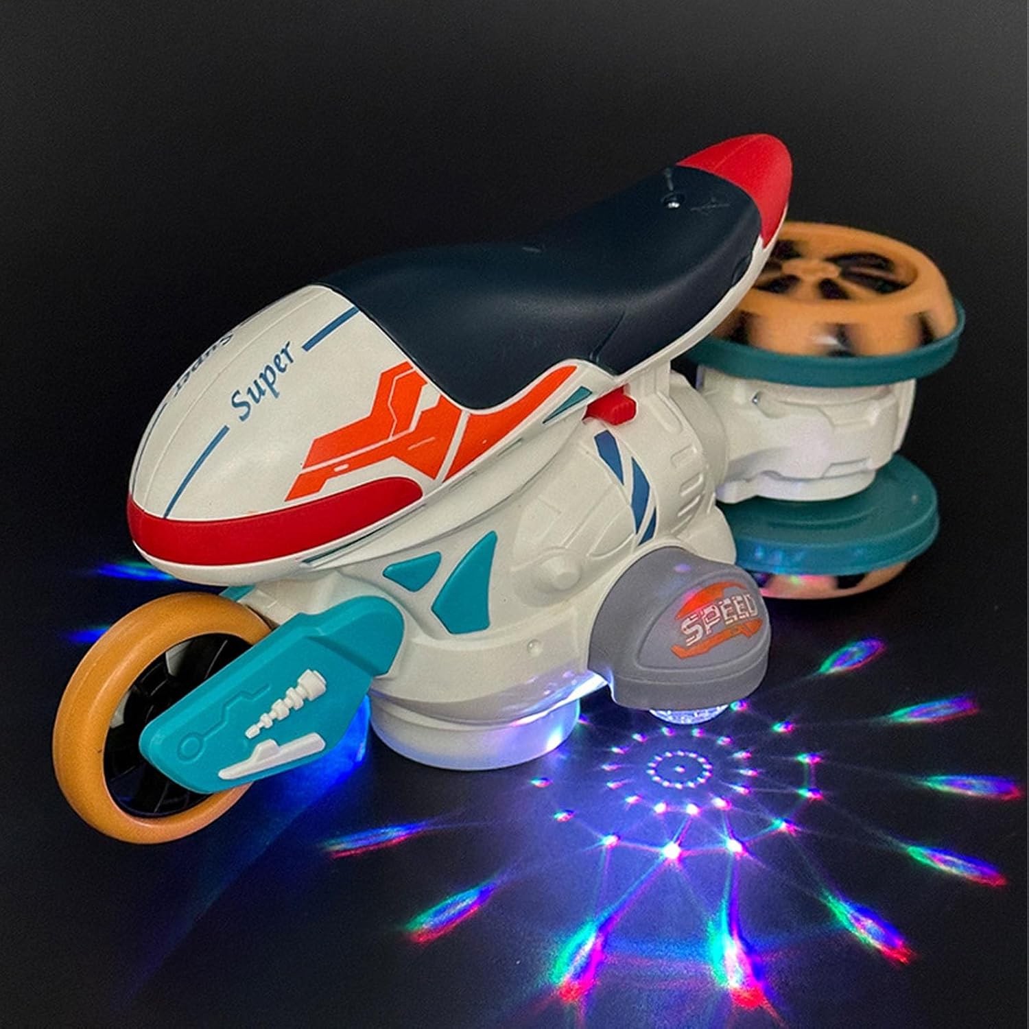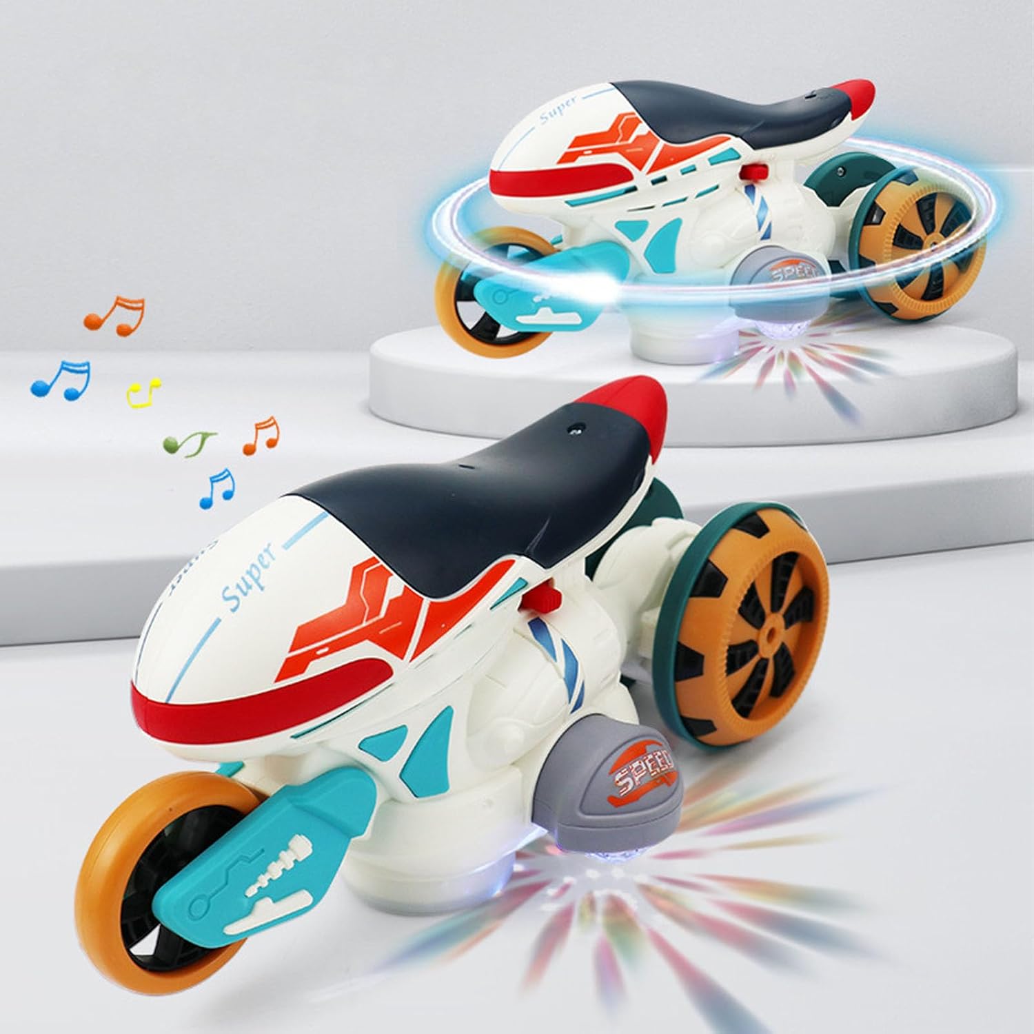 [Music and Light Effects] : The rotating motorbike comes with music and lighting effects for added fun, enhancing the overall play experience and keeping children engaged.
